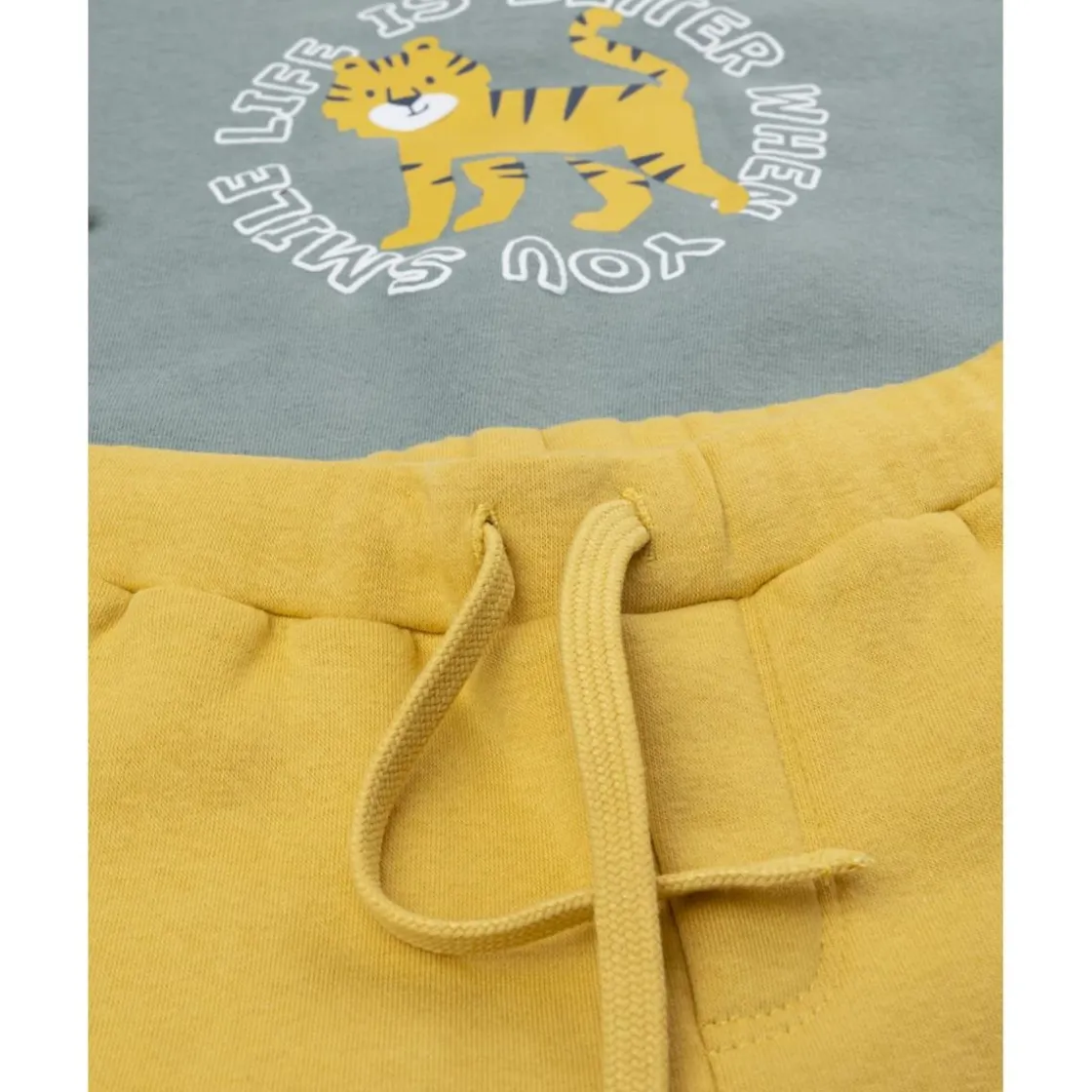 Divertido conjunto de jogging para bebé compuesto por sudadera verde con estampado central y pantalón amarillo con bolsillito trasero. El diseño casual-deportivo y los botones automáticos en la parte trasera facilitan la puesta, garantizando libertad de movimiento y suavidad al contacto con la piel.