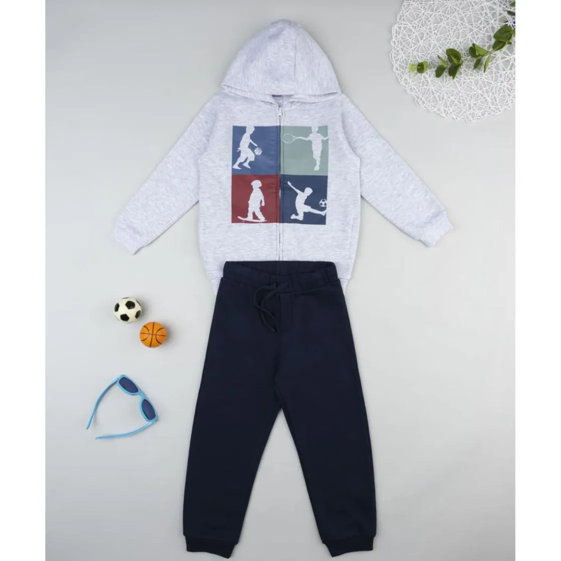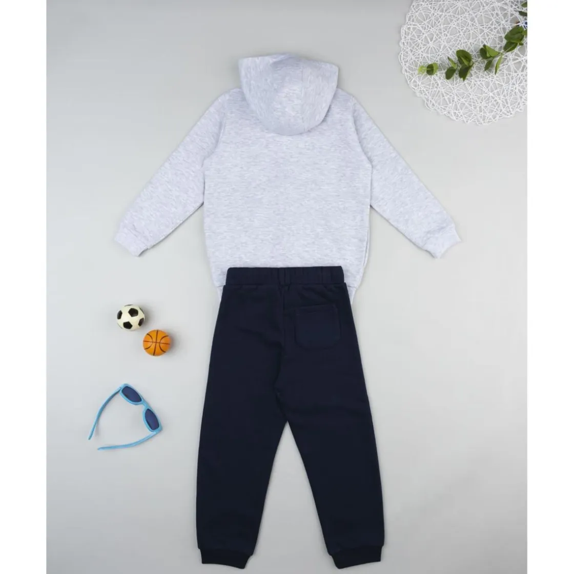 El conjunto jogging gris y azul es una opción cómoda y moderna para los más pequeños. Compuesto por una felpa gris con capucha y cremallera y unos pantalones azul marino con cintura elástica, garantiza libertad de movimiento y confort. Su interior aafelpado ofrece calidez y suavidad en los días fríos.