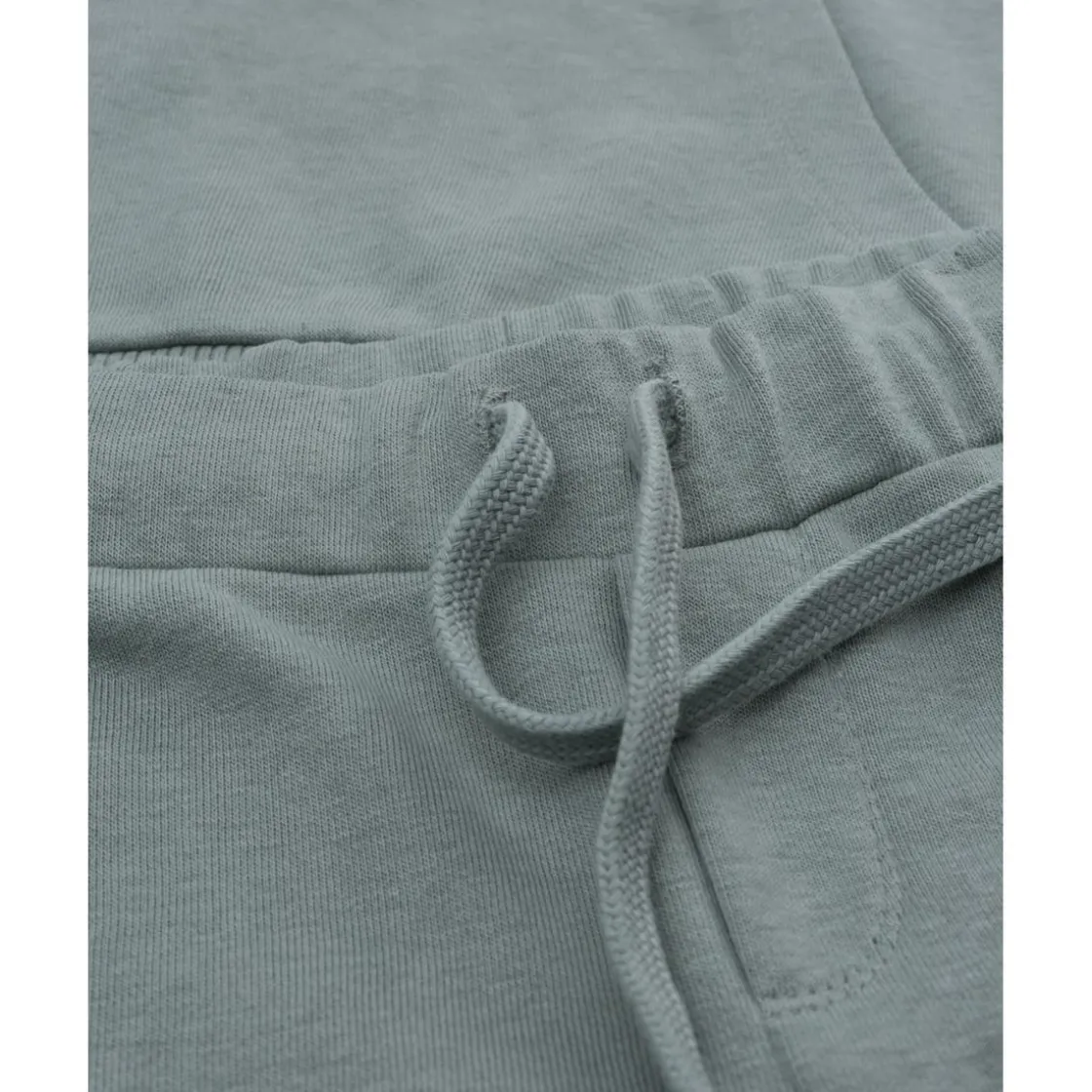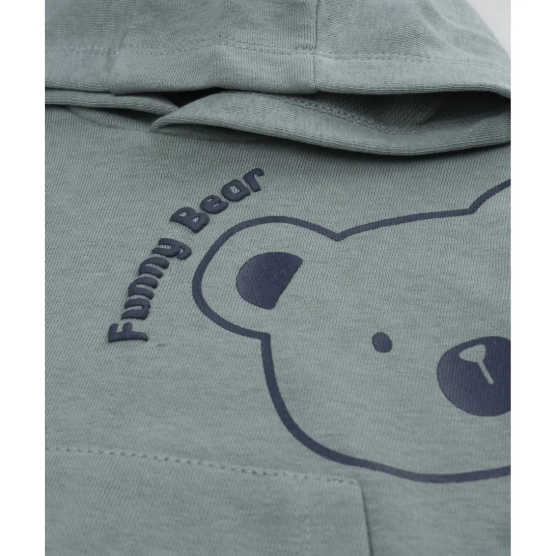 Conjunto casual tipo jogging para niño en tejido french terry. Incluye sudadera con capucha en verde con estampado de osito azul y bolsillo frontal, y pantalón verde con estampado en las rodillas y bolsillo trasero. Cintura ajustable con cordón. Ideal para momentos de juego.