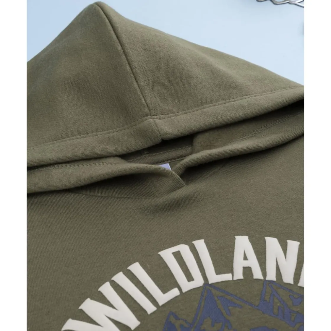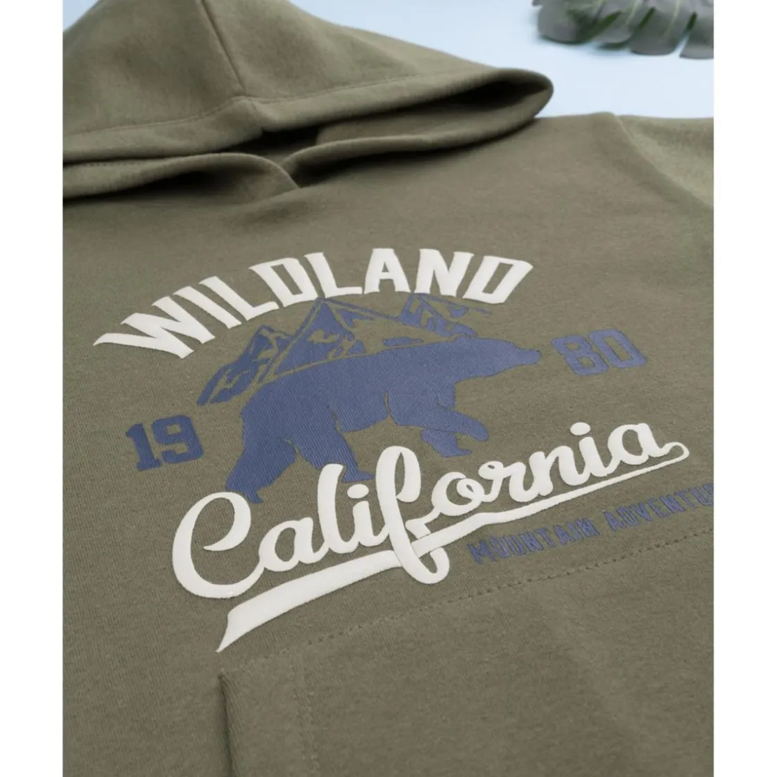Alegre conjunto de jogging para niño formado por sudadera verde con capucha y estampado, y pantalones felpados azul marino con cintura elástica. El tejido de mezcla de algodón ofrece suavidad y confort en todo momento, ideal para el juego o el descanso.