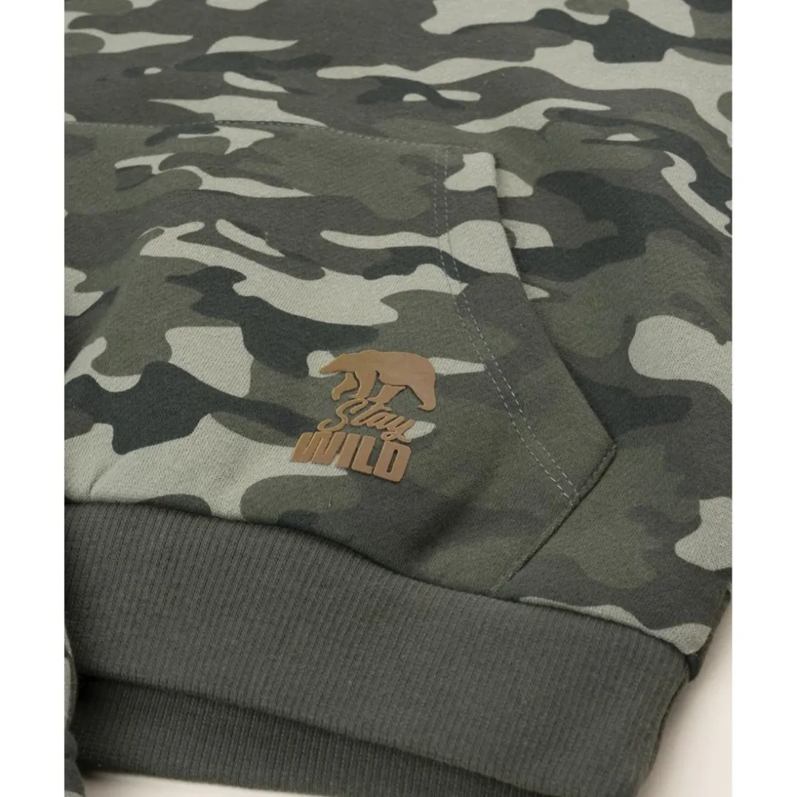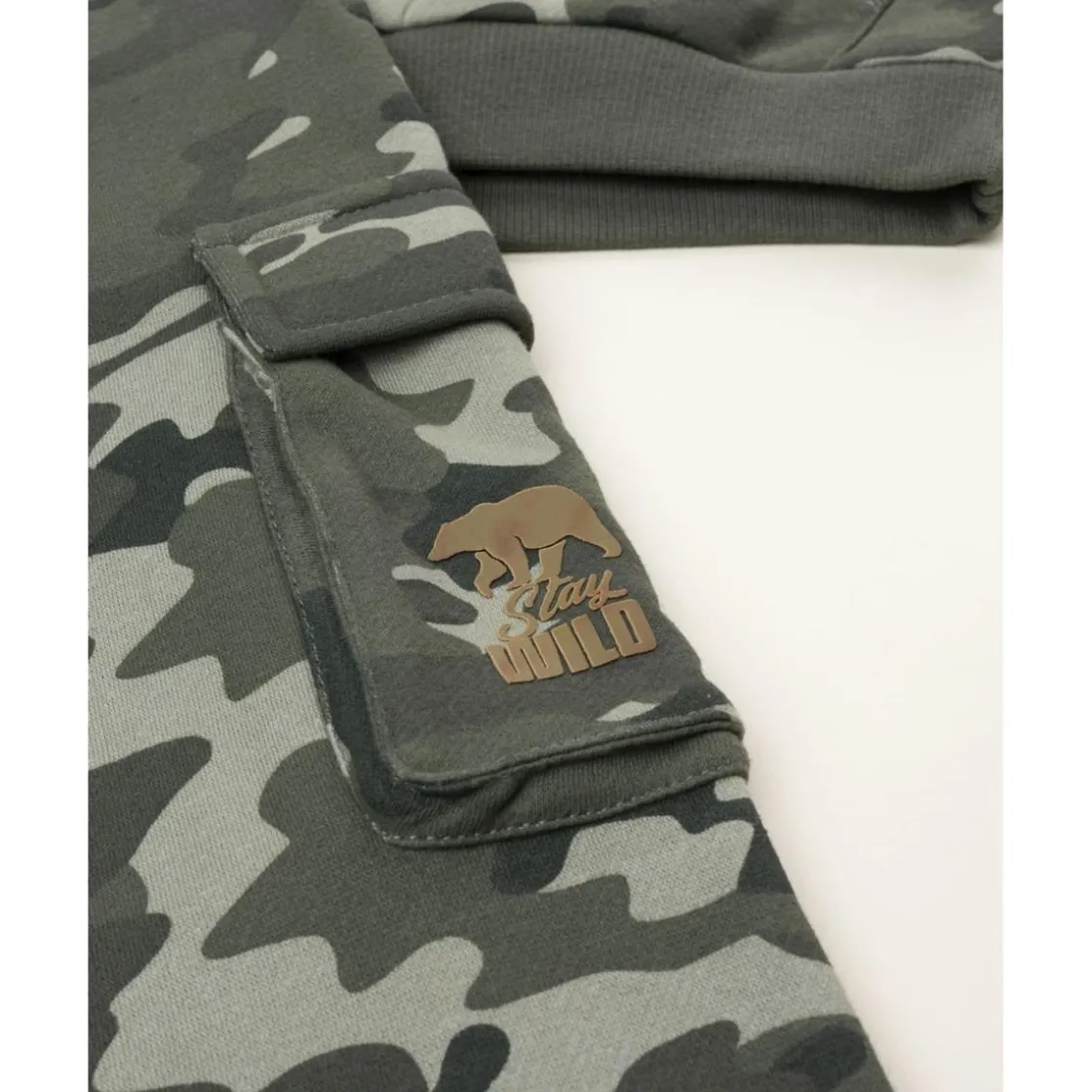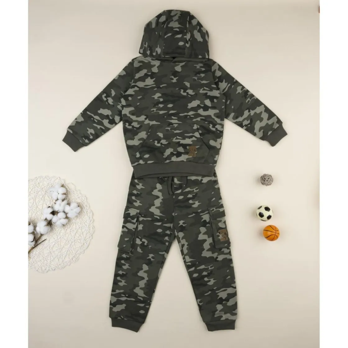 Moderno conjunto de dos piezas para niño con estampado camouflage. Incluye sudadera con capucha y bolsillo delantero, junto a pantalones cargo a juego con cintura elástica para un ajuste perfecto.