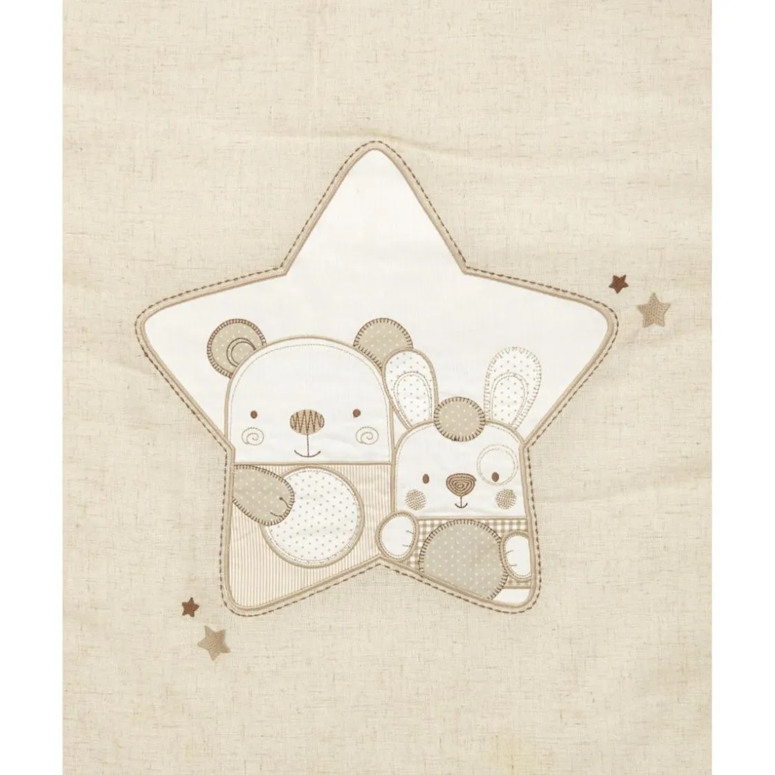Este cálido edredón acolchado para cuna o cochecito está confeccionado en algodón beige jaspeado. La parte frontal está decorada con el bordado de una estrella que contiene un parche de dos simpáticos animalitos. El reverso es de color crema con un estampado completo de pequeños lunares beige.