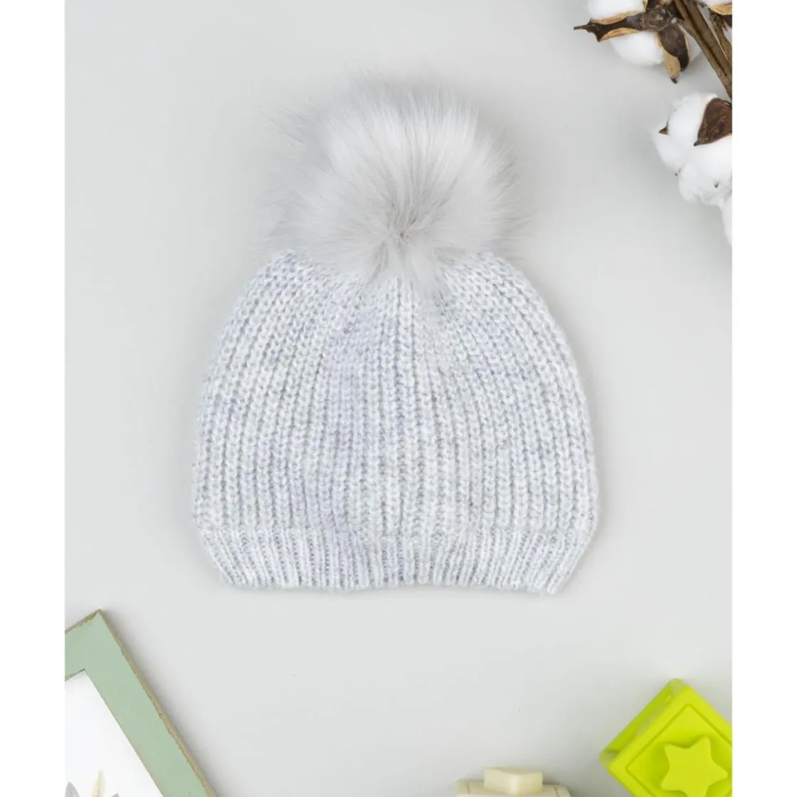 Tierno gorro con pompon para niña en gris claro con hilo lurex. Su ajuste es suave y envolvente, ideal para mantener la cabeza de la pequeña protegida del frío durante actividades casuales.