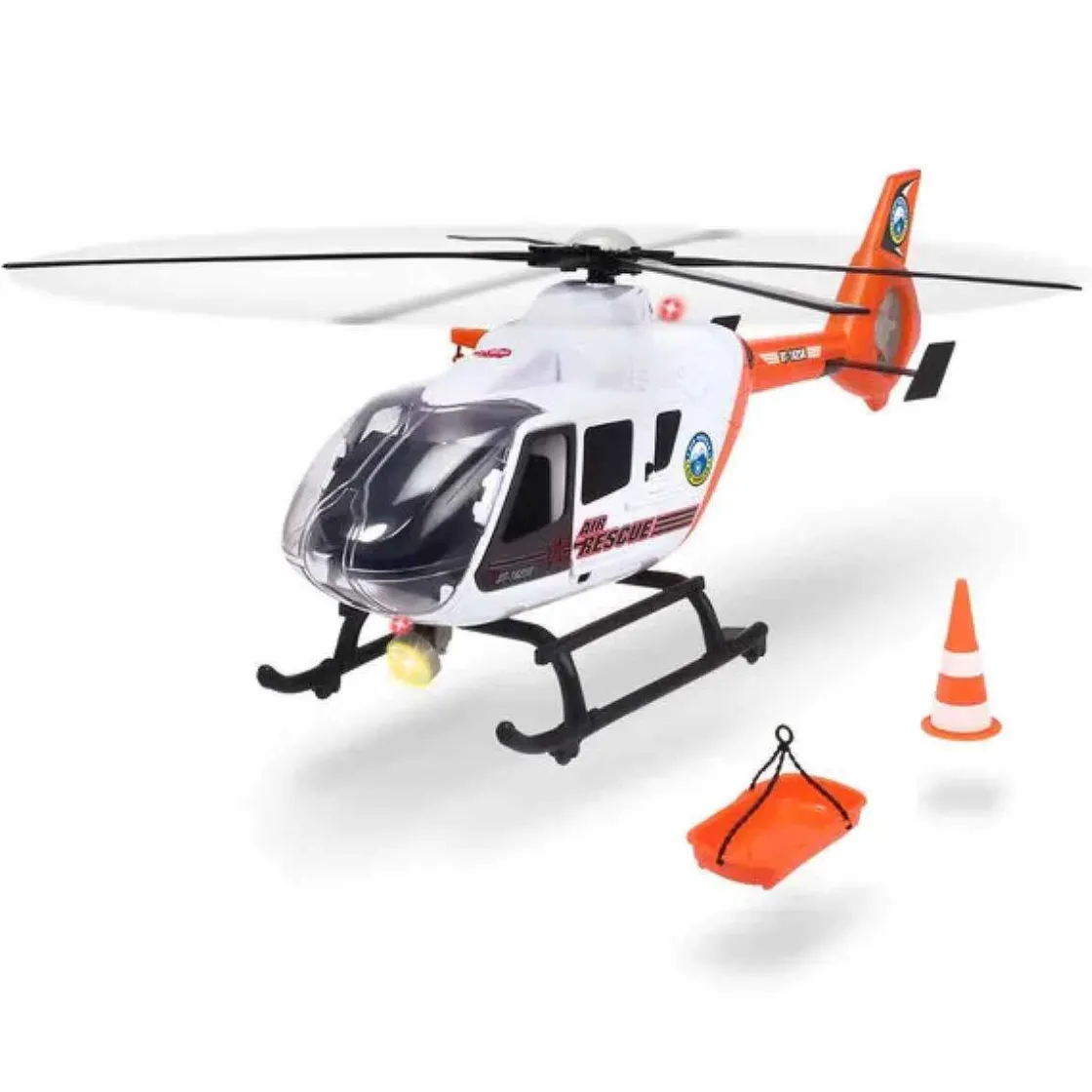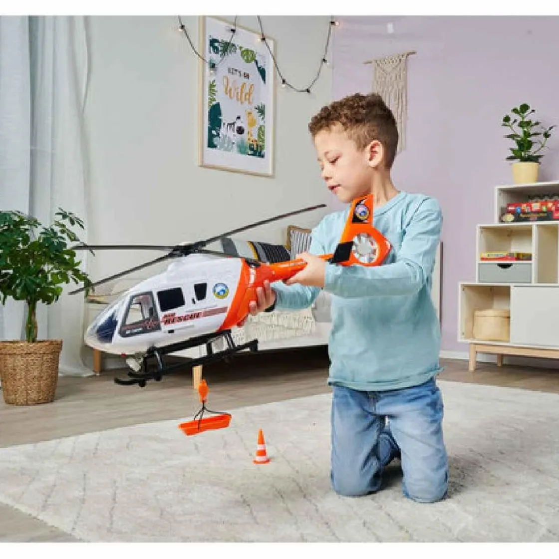 El helicóptero de rescate está equipado con hélices con rotor giratorio, cabrestante eléctrico y faros luminosos. Para ayudar a los jóvenes socorristas en su intervención, se pueden activar los efectos de luz y sonido. Baterias incluidas.