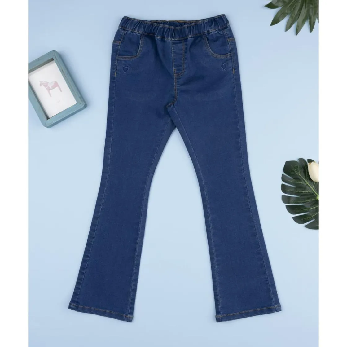 Características: corte acampanado, bordado corazón, cintura elástica, bolsillos frontales y traseros, tejido resistente con estiramiento.
