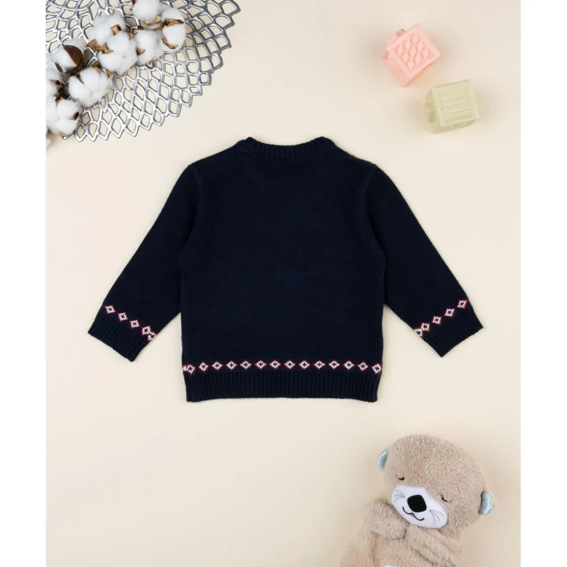 Suave jersey tricot para bebé en color azul marino con detalle de osito en blanco y rojo. Su cierre con botones en el hombro facilita el vestir y aporta un toque práctico sin renunciar al estilo.