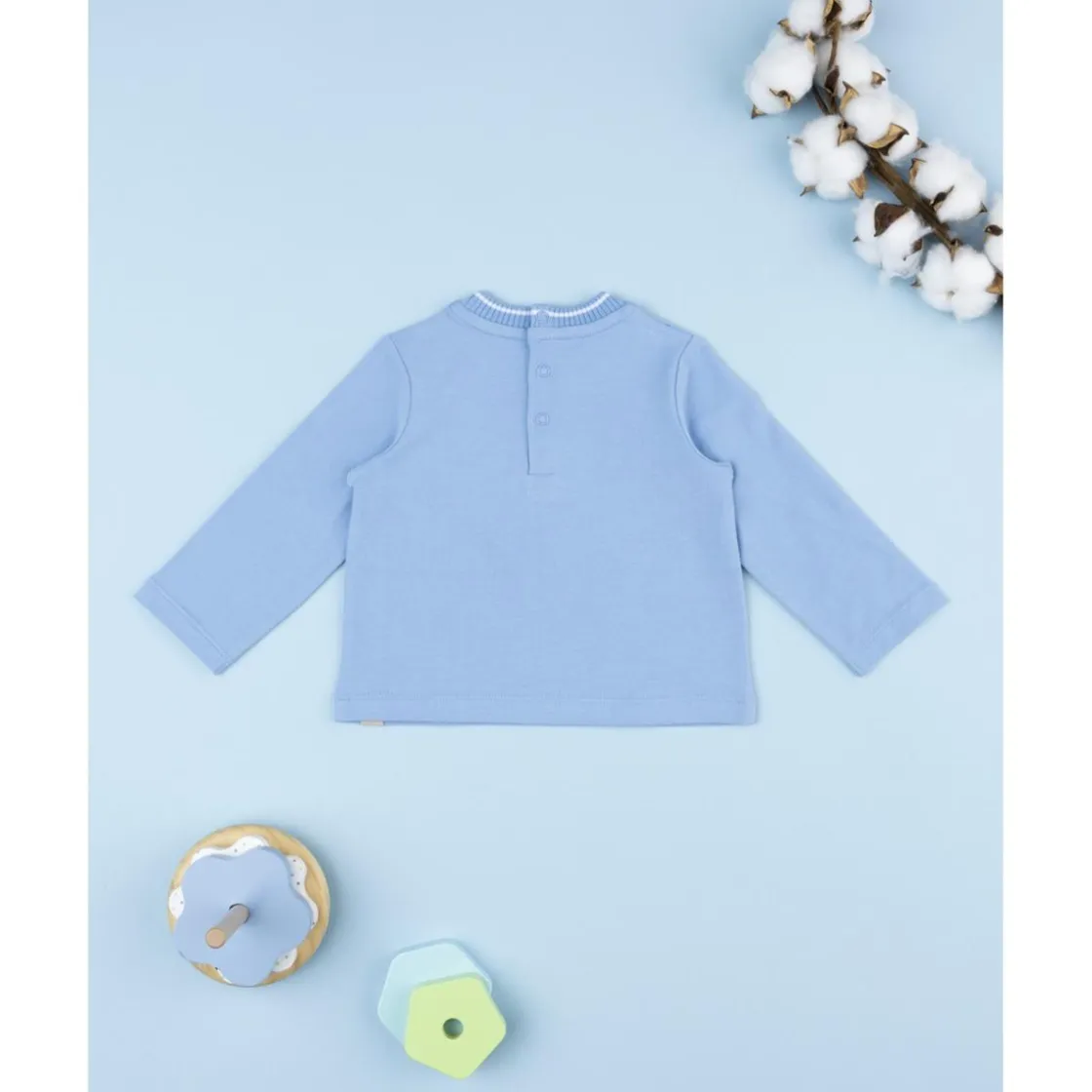 El jersey azul de niño con texto “Little Me” combina suavidad, diseño y practicidad. Confeccionado en algodón elástico certificado OEKO-TEX®, presenta un tacto agradable y una ligera elasticidad que se adapta a los movimientos. Su tono azul celeste y la inscripción frontal aportan un estilo moderno y dulce.