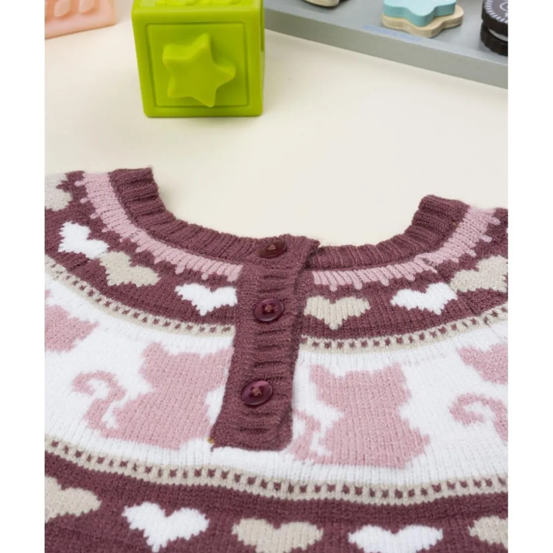 Encantador jersey tricot para niña en color rosa antiguo con dibujos tejidos de pequeños gatitos. Los botones en la espalda facilitan el vestir, manteniendo la suavidad y calidez del tejido.