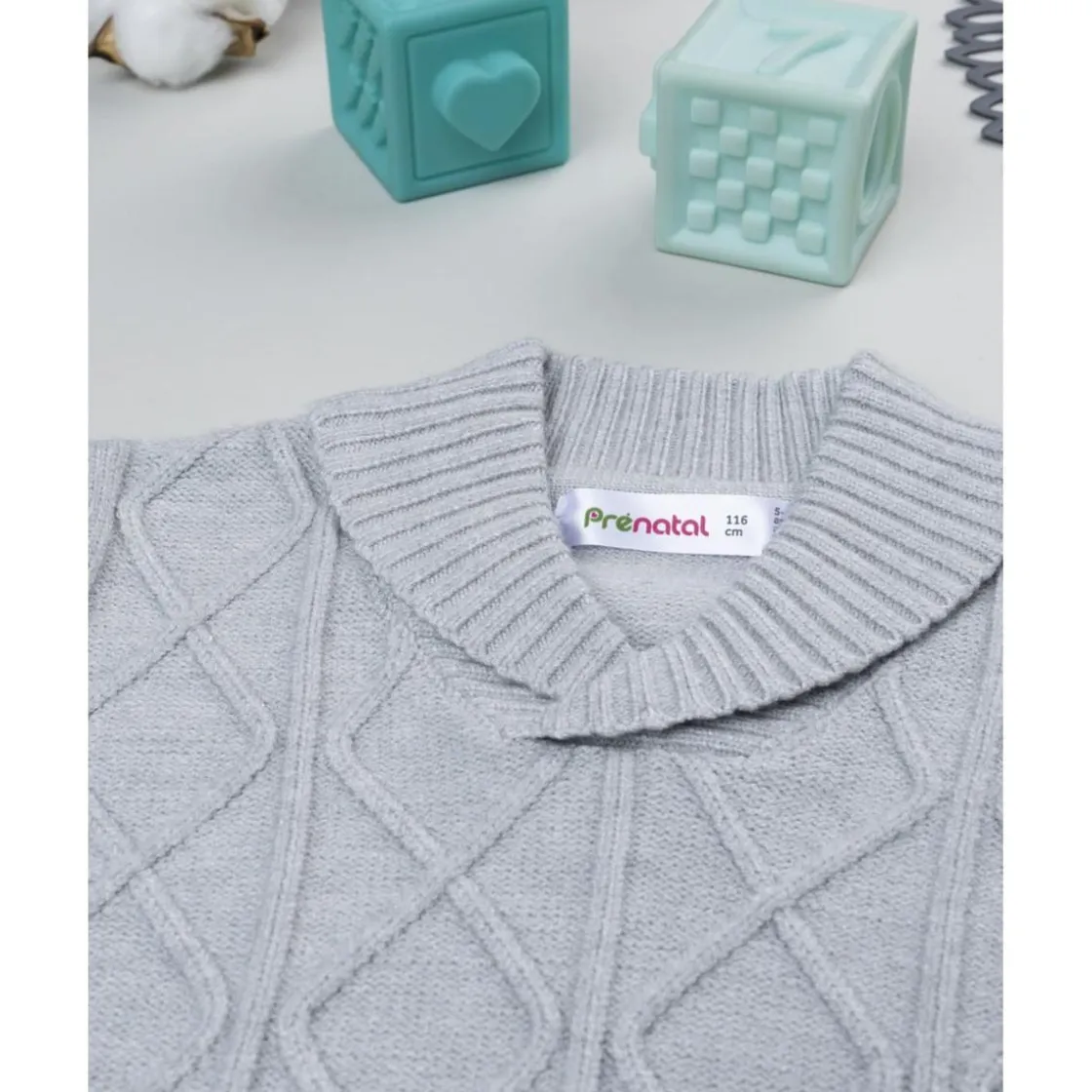 Clásico jersey tricot para niño en gris claro con cuello mao y textura entrelazada. Su tejido suave y su corte cómodo lo convierten en un básico imprescindible para el invierno.