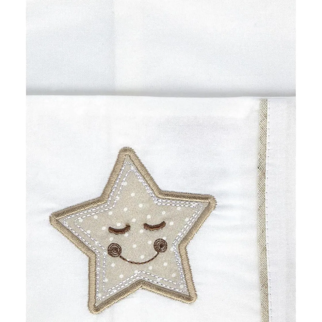 Este romántico juego de cuna/carrito de 3 piezas incluye una sábana bajera, una sábana encimera y una funda de almohada. La sábana superior está decorada con un bordado de una nube, una estrella y la inscripción «LET’S DREAM». La funda de almohada presenta un parche en forma de estrella.