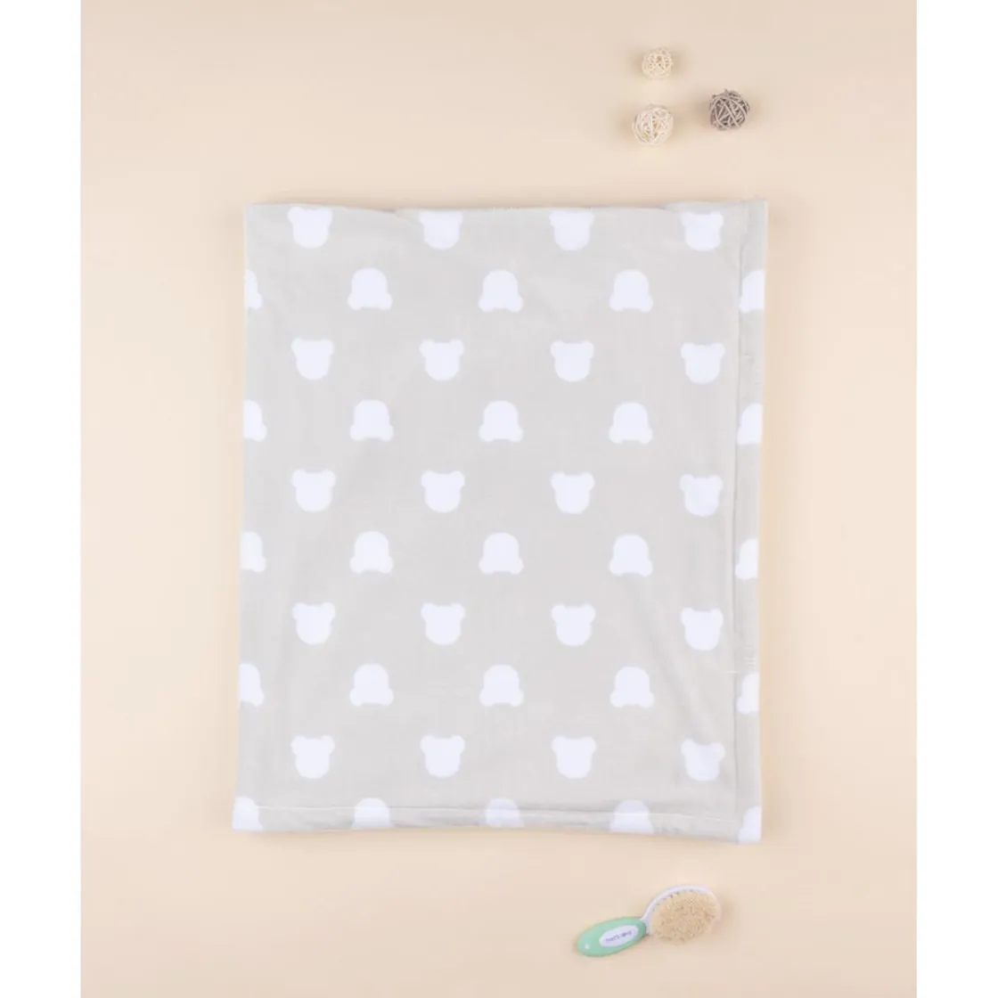 Diseño con un fondo gris claro y un estampado de ositos estilizados en tono crema. El reverso es beige.