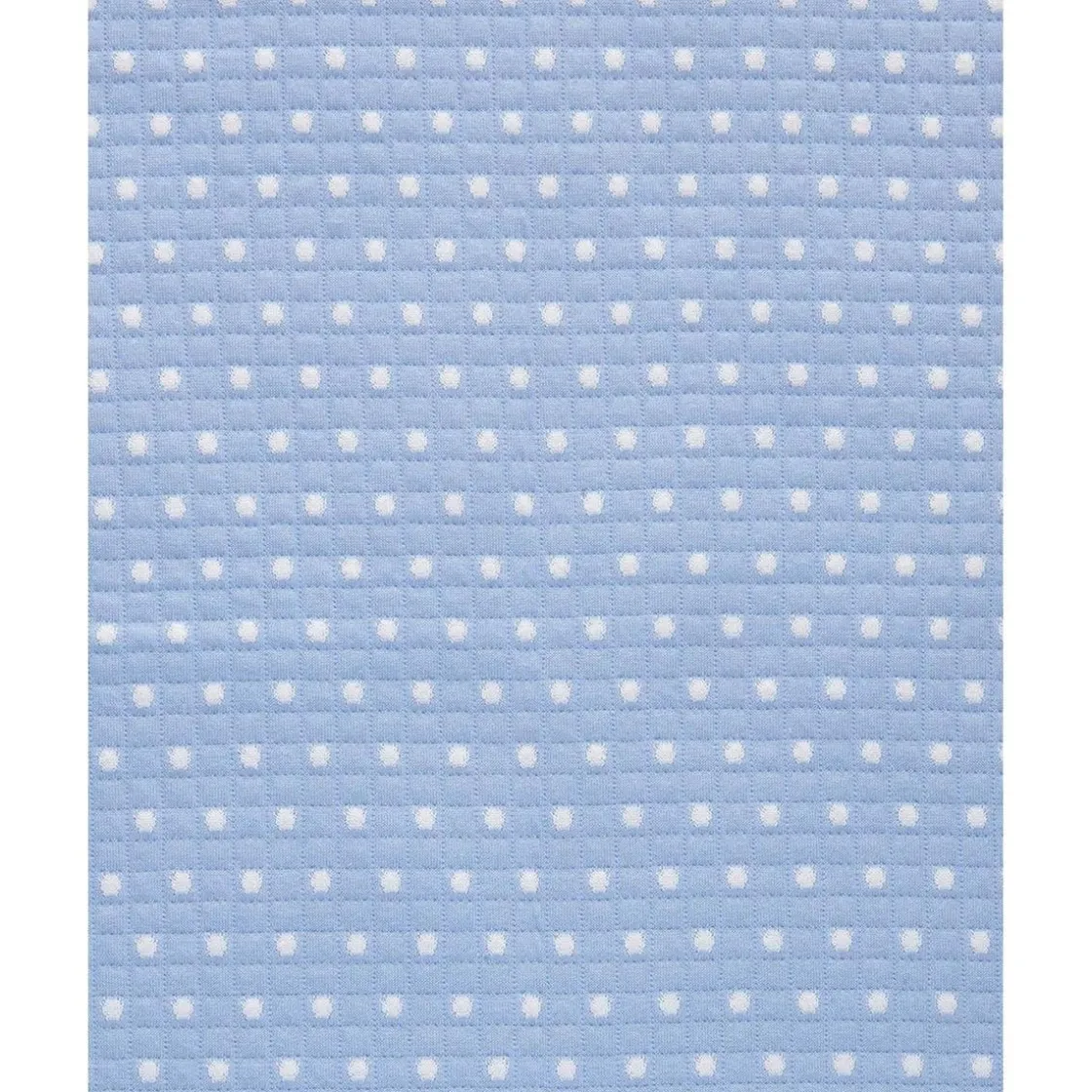 Descubre esta encantadora manta de cuna estival, perfecta para los meses más cálidos del año. Confeccionada en suave algodón, presenta un precioso diseño en tono azul cielo con un elegante borde blanco y pequeños motivos de puntos blancos que le aportan un toque de dulzura.