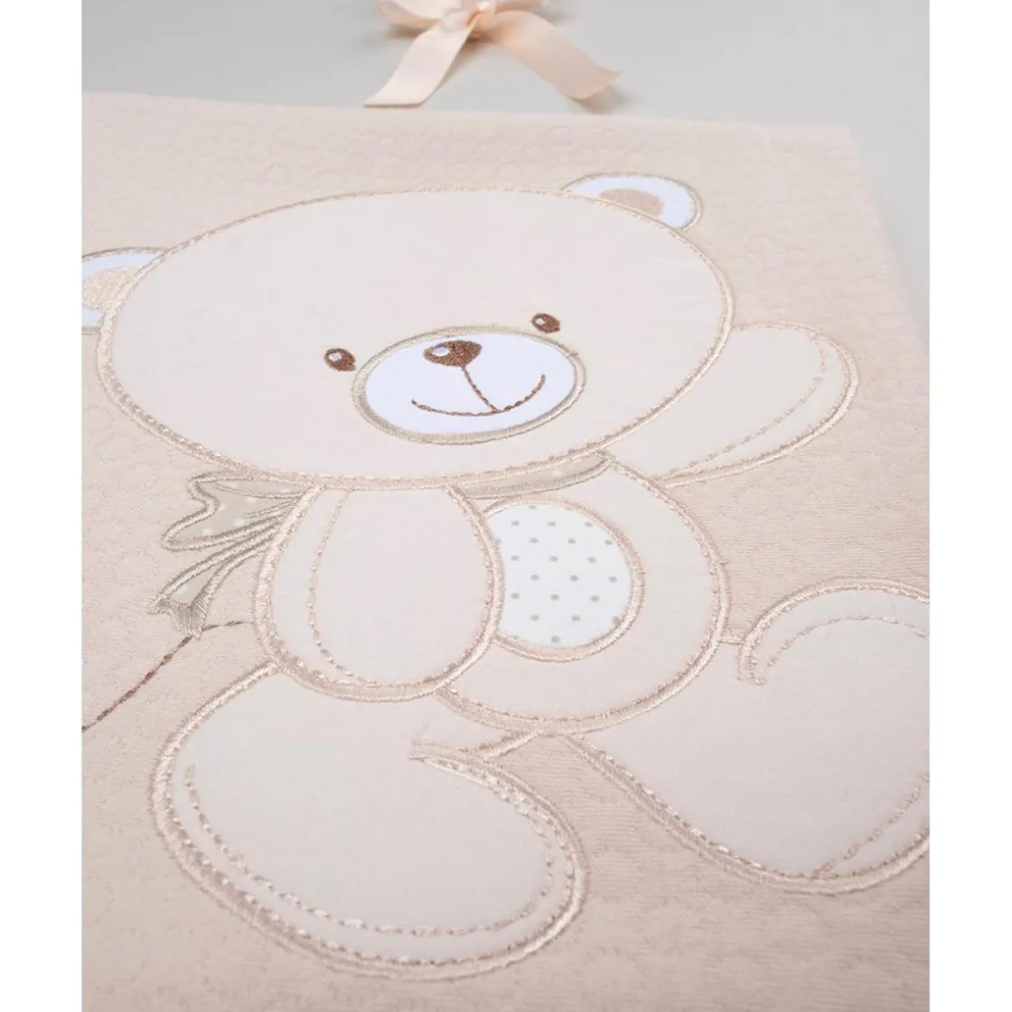 Esta manta para cuna combina suavidad y elegancia. Con una base beige y un delicado bordado de un osito en la parte frontal, es la elección perfecta para mantener a su bebé cómodo y añadir un toque de dulzura al espacio.
