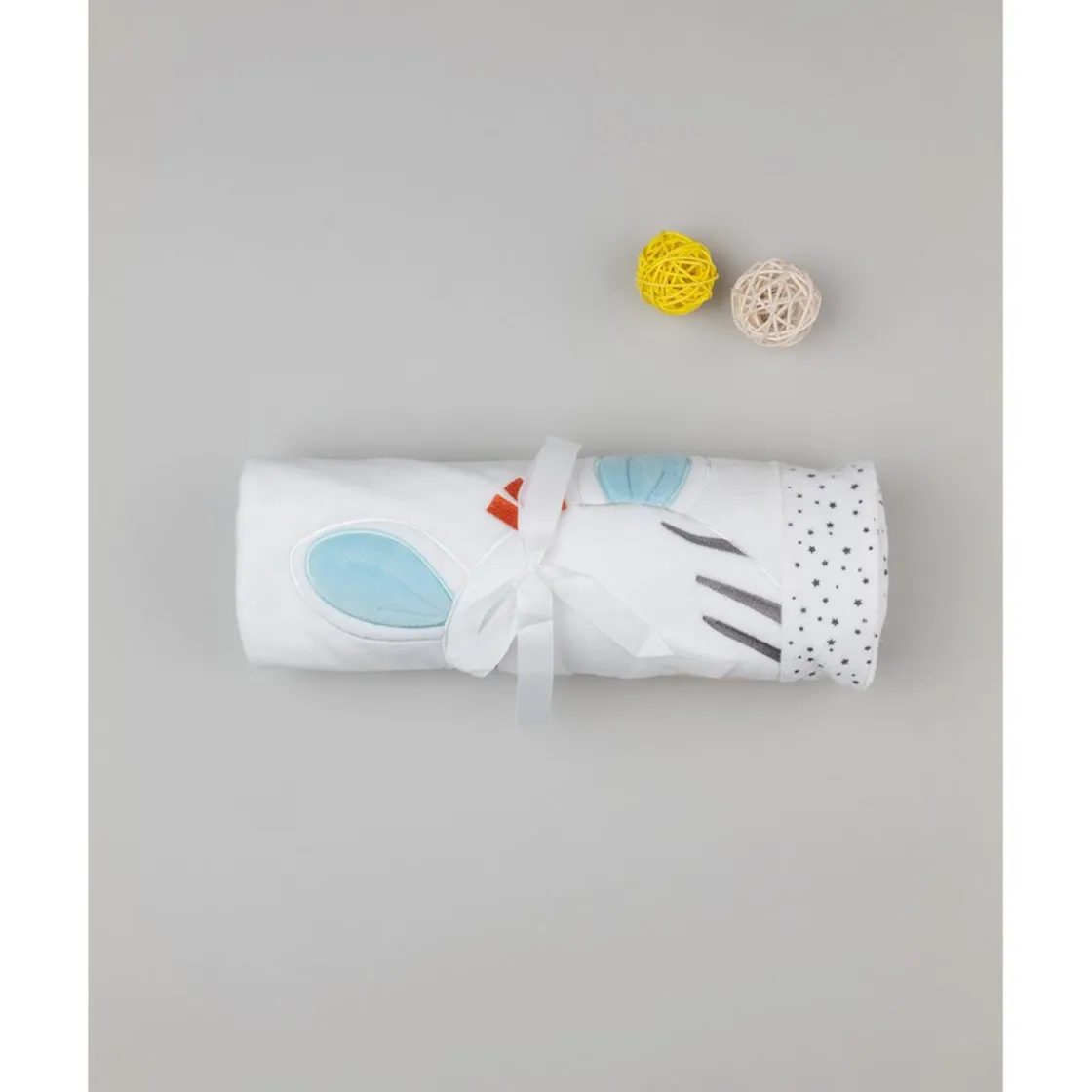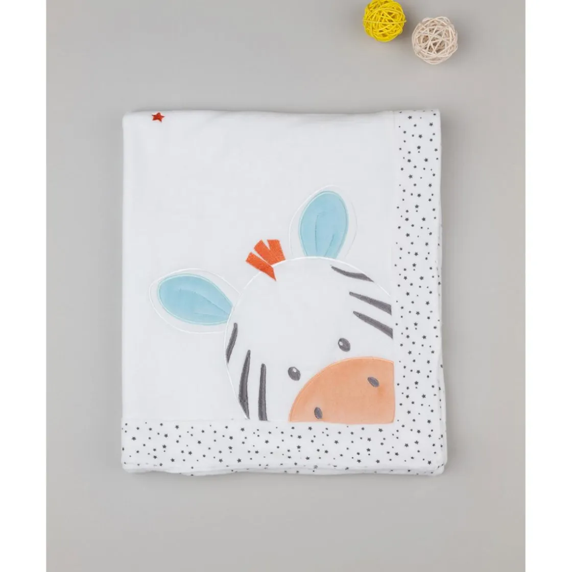 Suave manta de cuna en terciopelo de la línea Baby Smile. Presenta divertidos animalitos de colores sobre fondo blanco.