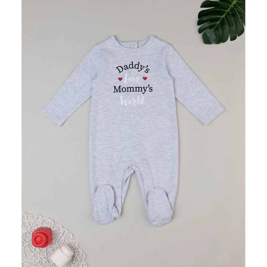 Tierna pelele unisex. La prenda se presenta en una sola pieza con patucos coordinados y se desarrolla en un total gris claro con estampado «Daddy Mommy» en negro y rojo. El ajuste es suave y práctico gracias a los botones automáticos en la parte trasera y la entrepierna. La prenda es de algodón oeko-tex, probado para sustancias nocivas garantiza alta seguridad. Accesorios no a la venta. El embalaje contiene solo la prenda de vestir