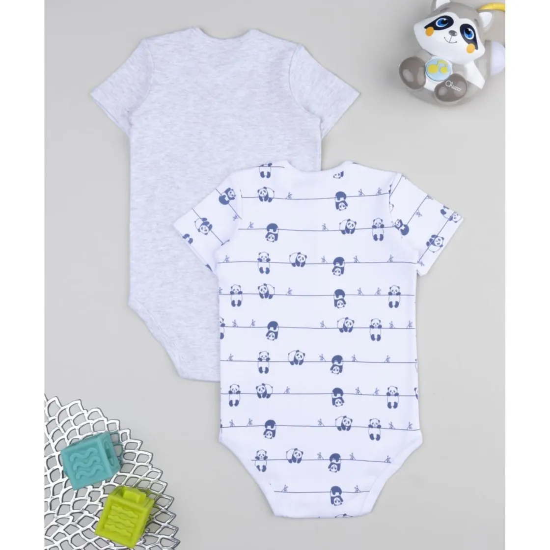 Este pack de 2 bodies para niño es una opción práctica y cómoda para el uso diario. Incluye un body en color blanco liso y otro en gris claro, ambos con un divertido estampado de panda que añade un toque tierno y original al conjunto.