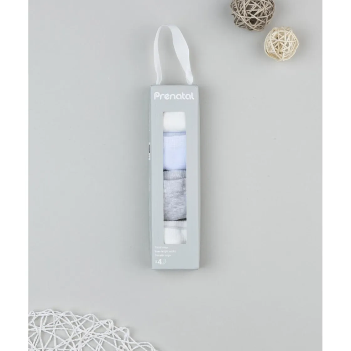 Práctico pack básico de 4 pares de calcetines para niño en blanco, azul y gris. Cintura elástica en el tobillo que evita molestias. Suaves y envolventes para la máxima comodidad.