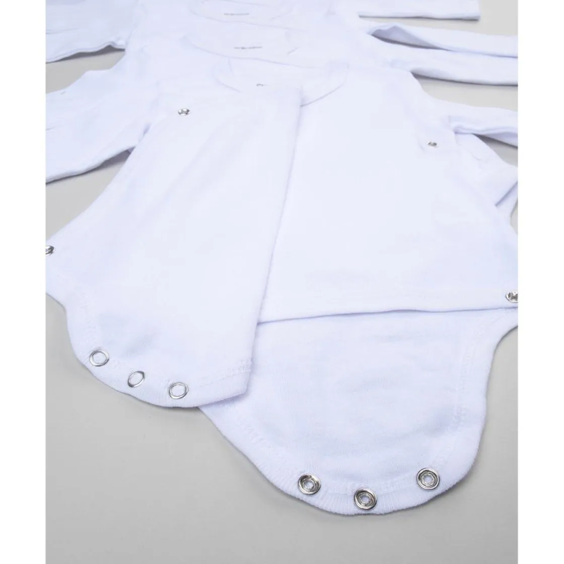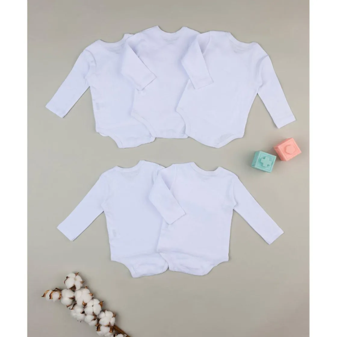 Pack compuesto por cinco bodis de algodón de color blanco con manga larga y cuello cruzado con broches en el lateral y en la entrepierna para un ajuste práctico y cómodo. Accesorios no a la venta. El paquete contiene sólo la prenda de vestir.