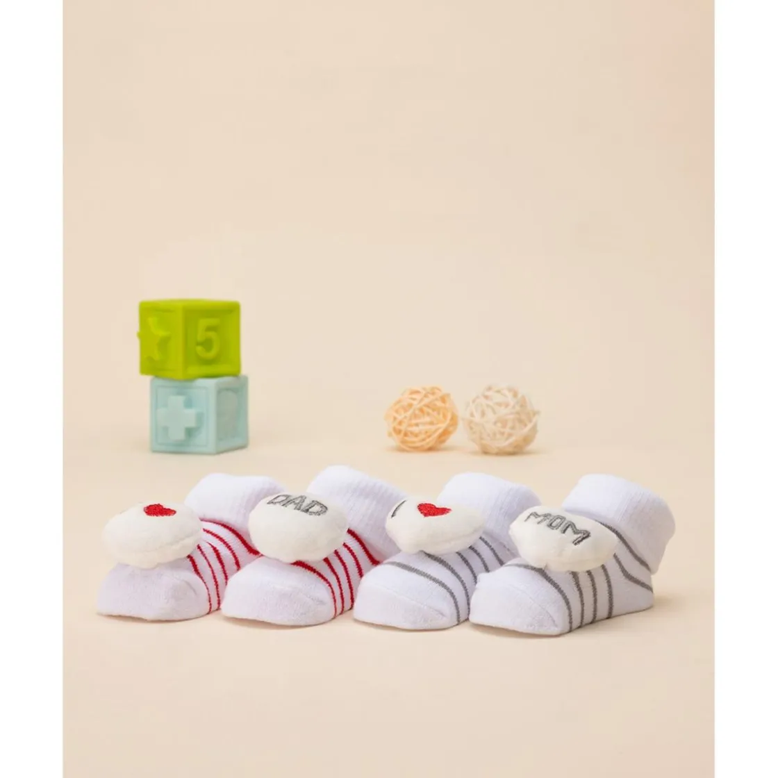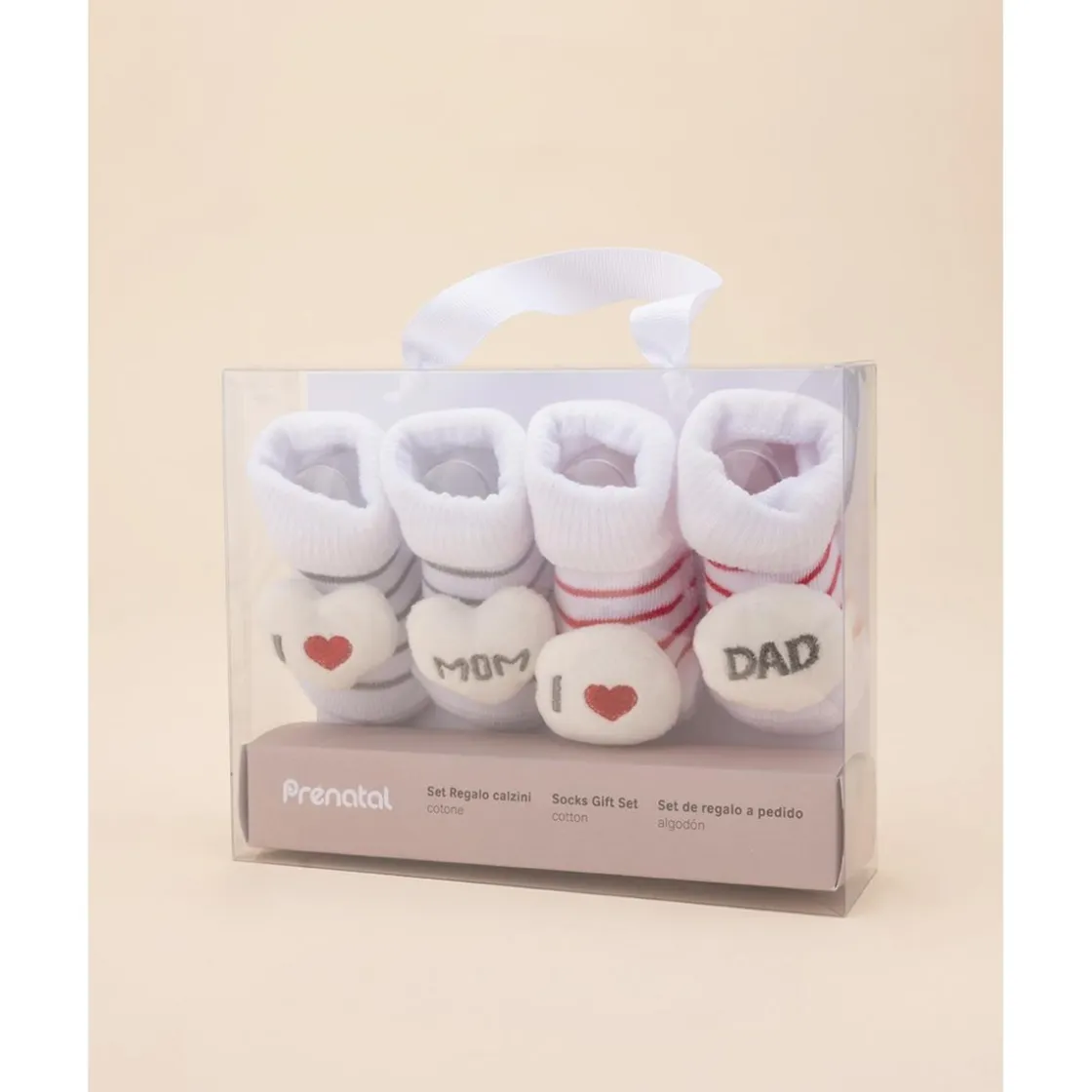 Este tierno pack incluye dos pares de calcetines para recién nacido, cada uno con un diseño de rayas: uno en gris claro y otro en rojo. Ambos cuentan con parches que dicen «love mom» y «love dad», añadiendo un toque adorable al atuendo del bebé. Se venden juntos en una única presentación.