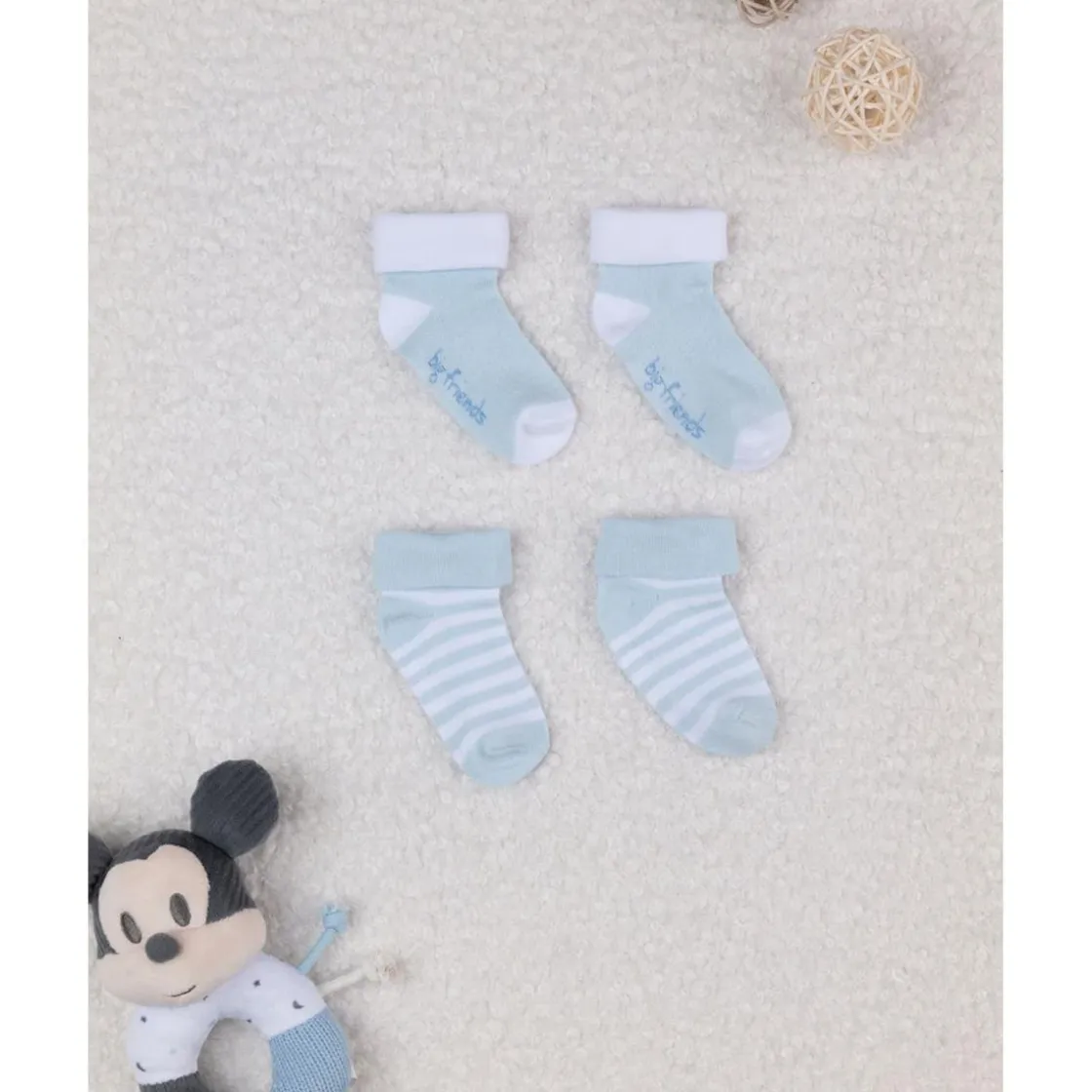 Asegura suavidad y confort desde los primeros días con este pack de 2 calcetines de algodón para recién nacido. Incluye un par en color blanco liso y otro en azul celeste con diseño de rayas, ambos con vuelta en el tobillo para una sujeción delicada y sin molestias.