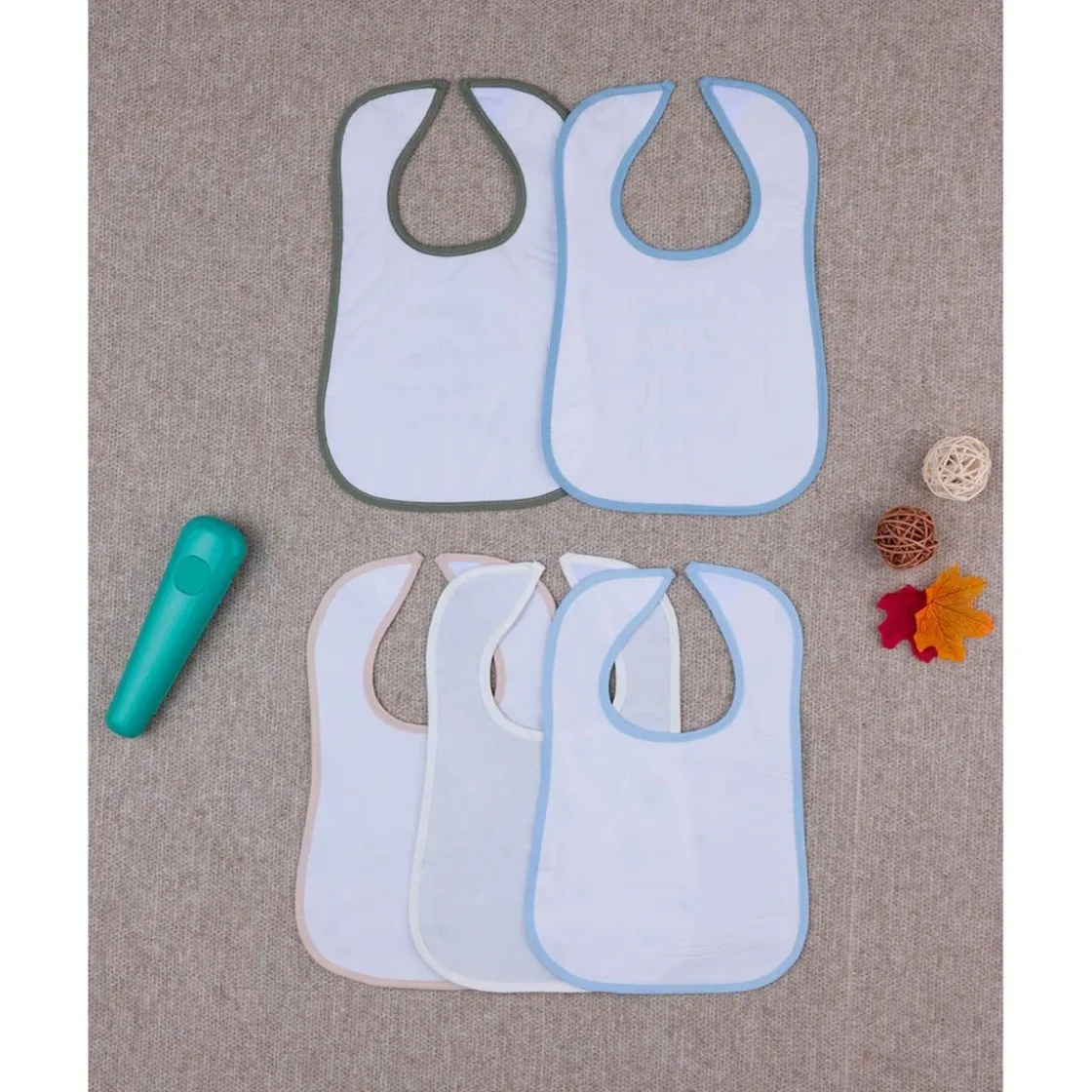 Este práctico pack consta de cinco baberos de rizo con divertidos estampados. La parte posterior está plastificada para evitar que la ropa del bebé se moje, y cuentan con un cierre de velcro que facilita su colocación y ajuste. Ideales para las comidas diarias.