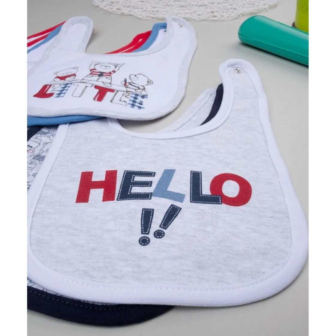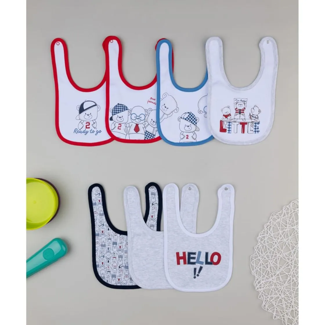 Este práctico set incluye siete baberos esenciales para el día a día del bebé. Fabricados en interlock 100% algodón OEKO-TEX® de 210 gr/m², destacan por: