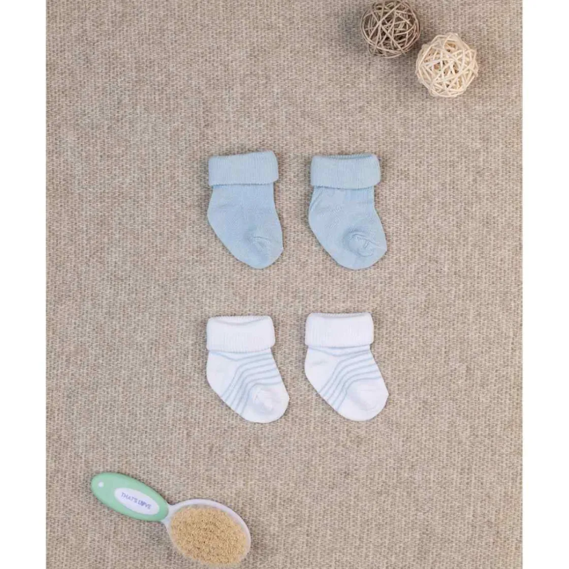 Empaque 2 pares de calcetines de algodón. Un par es liso de color azul claro. El otro es blanco con rayas azules. Accesorios no a la venta. El paquete contiene solo la prenda de ropa.