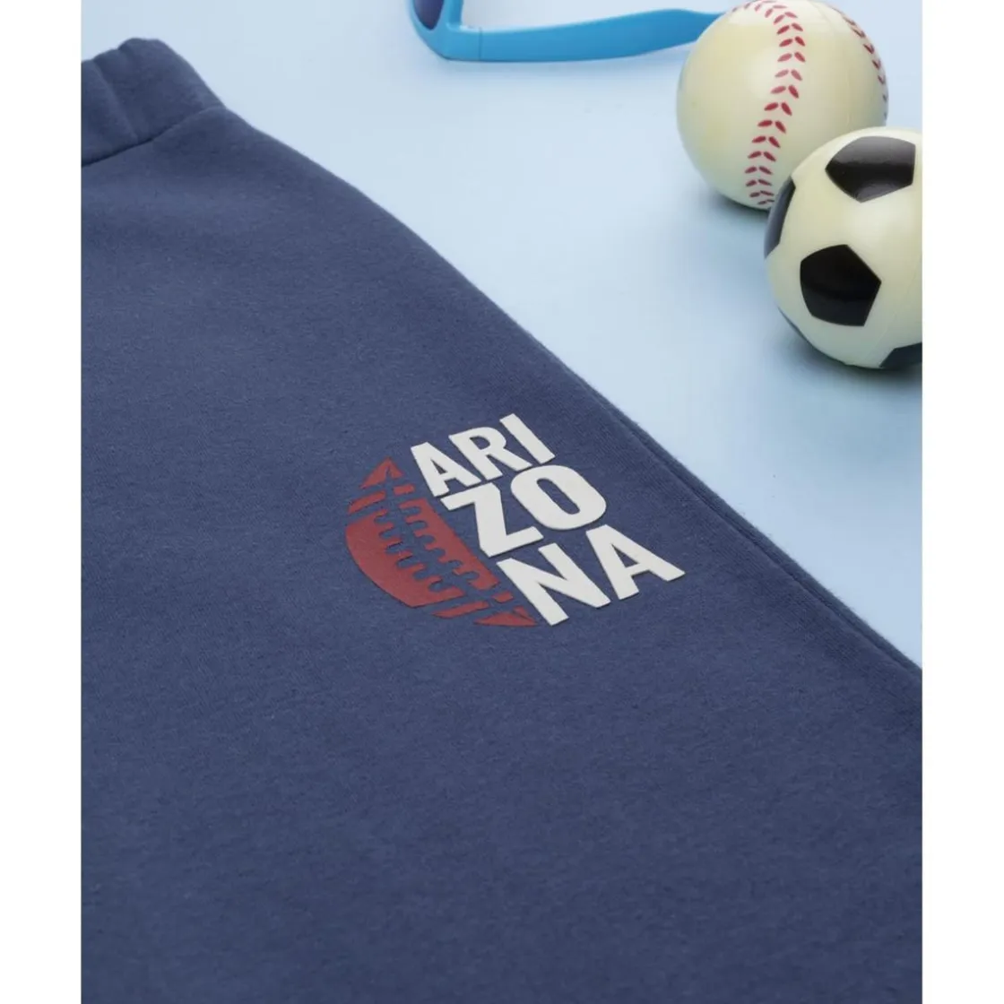 El pantalón azul con estampado es una prenda esencial para los looks informales del día a día. Confeccionado en algodón felpado, ofrece abrigo y suavidad. De color azul marino, presenta una pequeña impresión decorativa y una cintura con cordón ajustable para un ajuste cómodo y seguro.