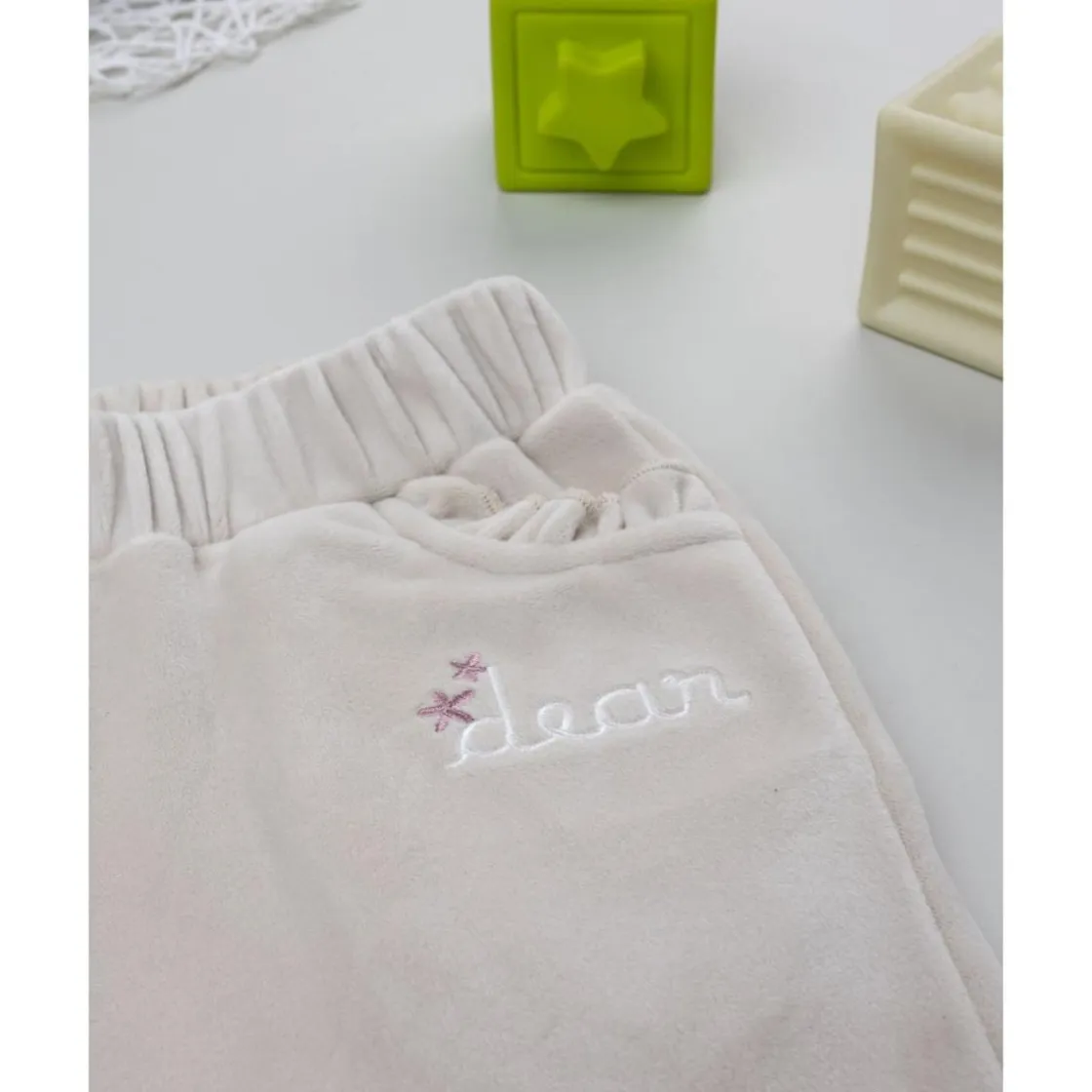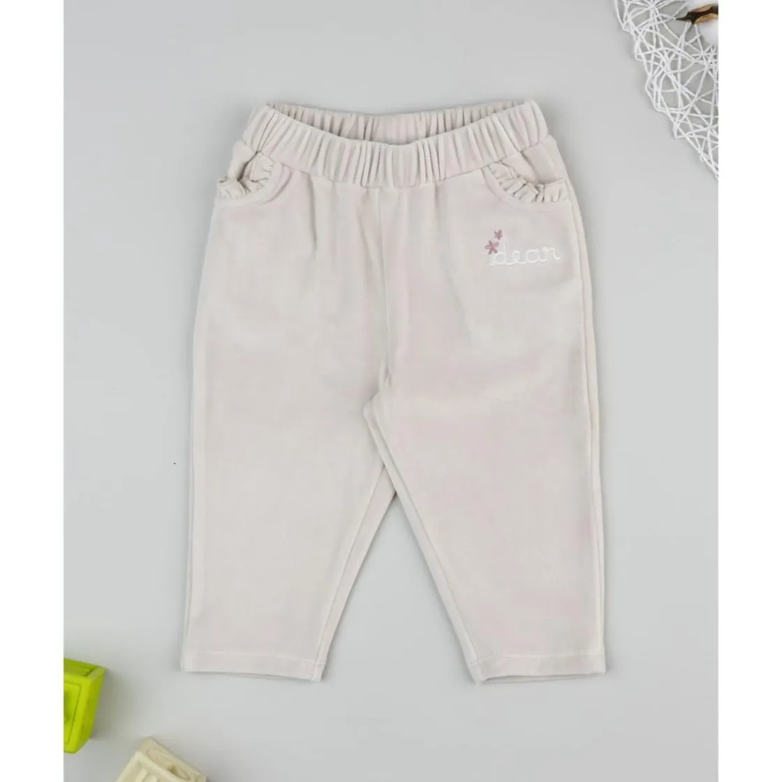 El pantalón de terciopelo beige para niña destaca por su suavidad y acabado elegante. Con fruncidos en los bolsillos delanteros y un delicado bordado, resulta ideal para conjuntos cómodos y con estilo.