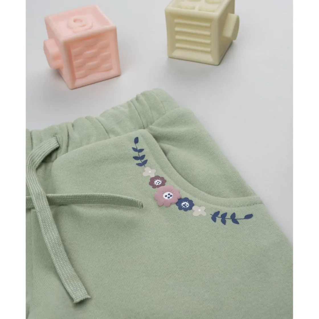 Encantador pantalón tricot para niña en verde claro con delicados bordados florales en las bolsillos. Su tejido suave y la cintura ajustable con cordón garantizan comodidad y libertad de movimiento.