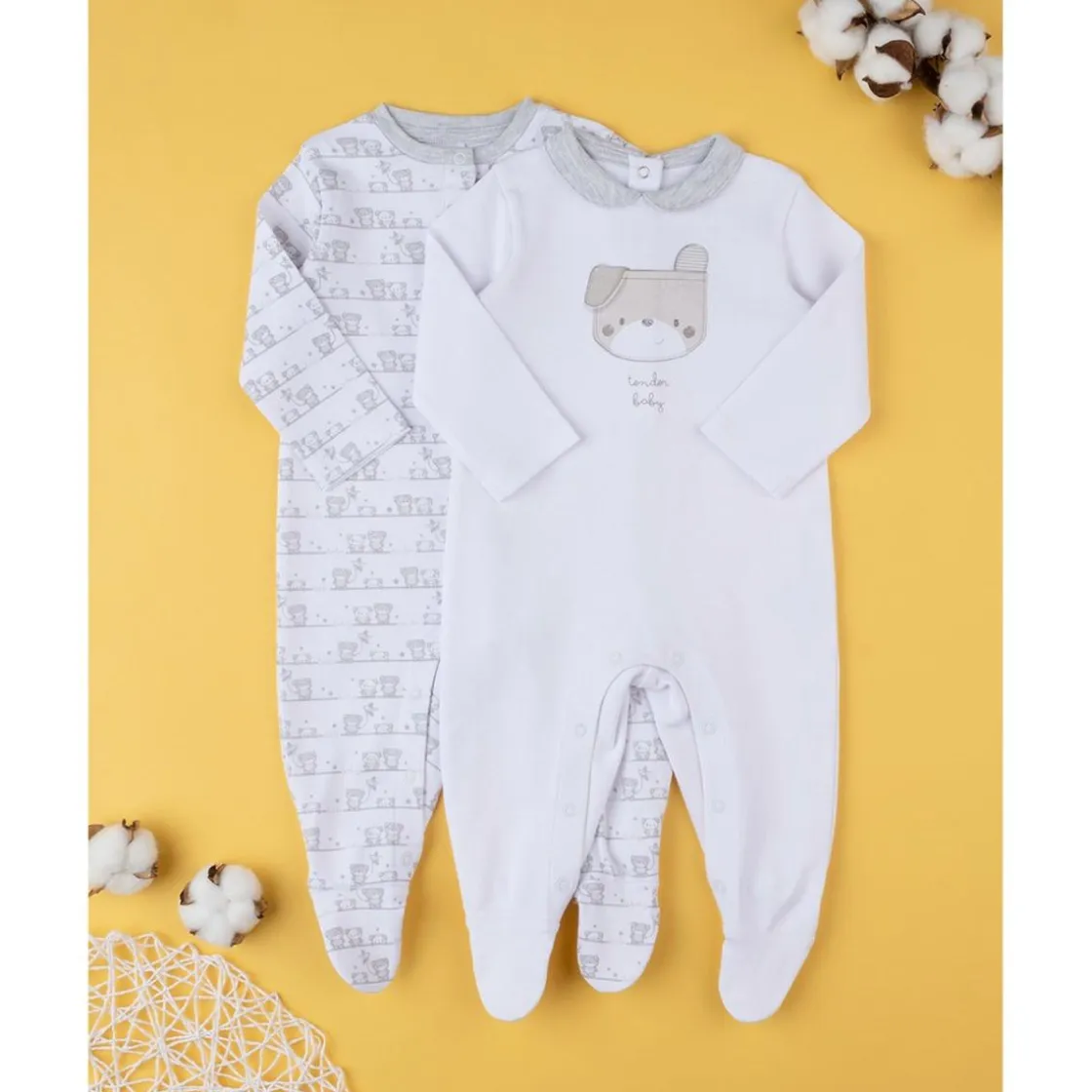 Tierna paquete 2 peleles unisex en 100% algodón. Las prendas se presentan en una sola pieza con patucos coordinados y cuello peter pan. La coloración se basa en un fondo blanco y detalles en gris claro, representados por ositos estilizados. La vestimenta es suave y práctica gracias a botones automáticos presentes en la entrepierna y en la parte trasera o frontal. Accesorios no a la venta. El paquete contiene solo la prenda de vestir
