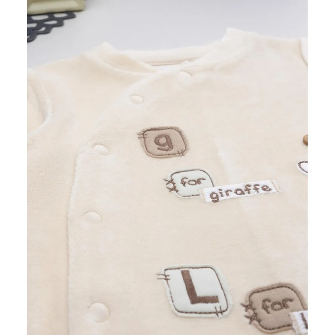 Dulce pelele de terciopelo para bebé. Prenda de una pieza con pie, en base beige con imágenes de tierna jirafa y leoncito jugando al escondite. Ajuste suave y práctico con botones automáticos en línea transversal en el frente y en la entrepierna. Fabricado en algodón oeko-tex, probado para sustancias nocivas que asegura alta seguridad. Accesorios no incluidos. El paquete contiene solo la prenda de vestir.