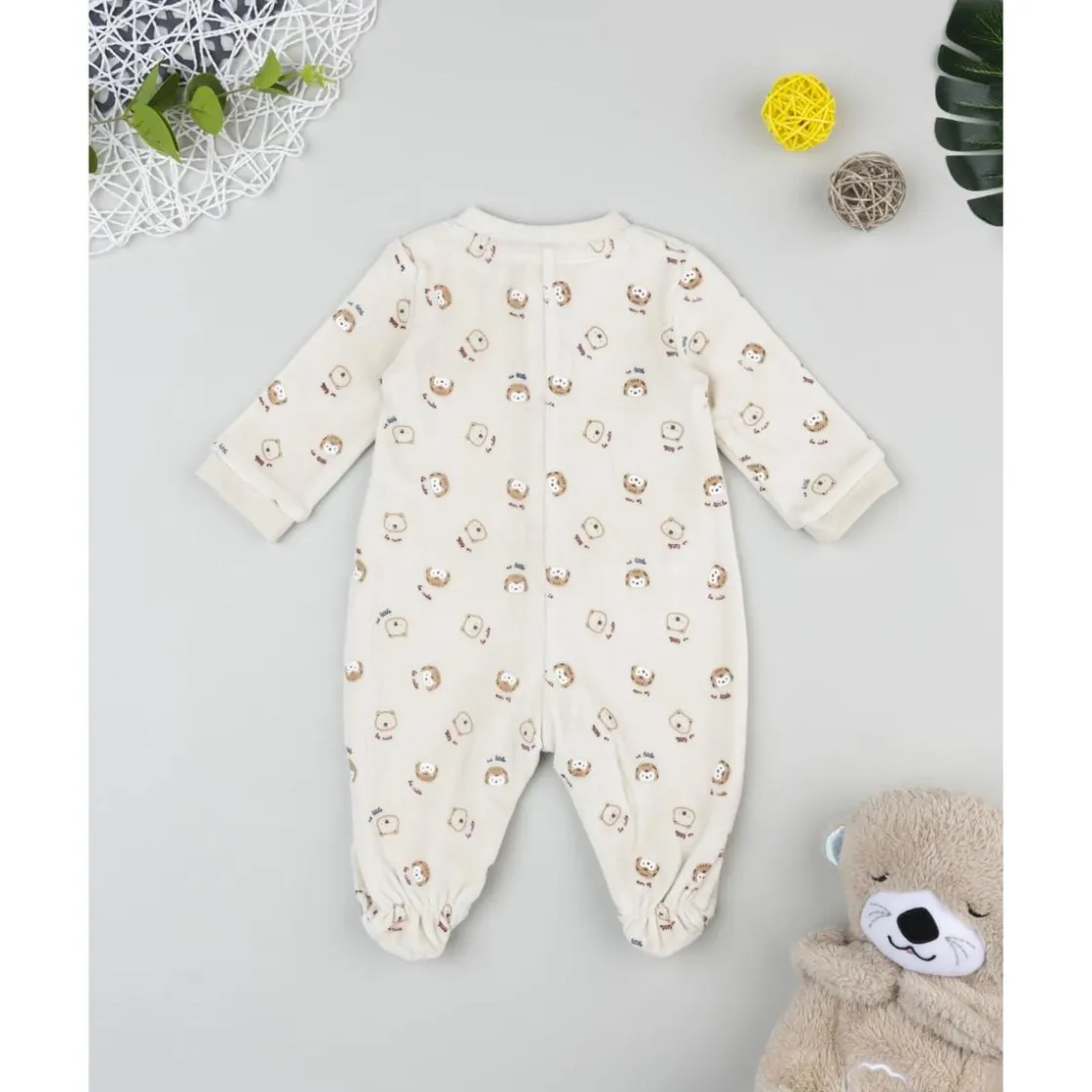 El pelele de terciopelo beige para recién nacido es una prenda suave y confortable. Presenta estampado allover de pequeños animales, con bolsillos aplicados en la parte frontal que aportan encanto al diseño.