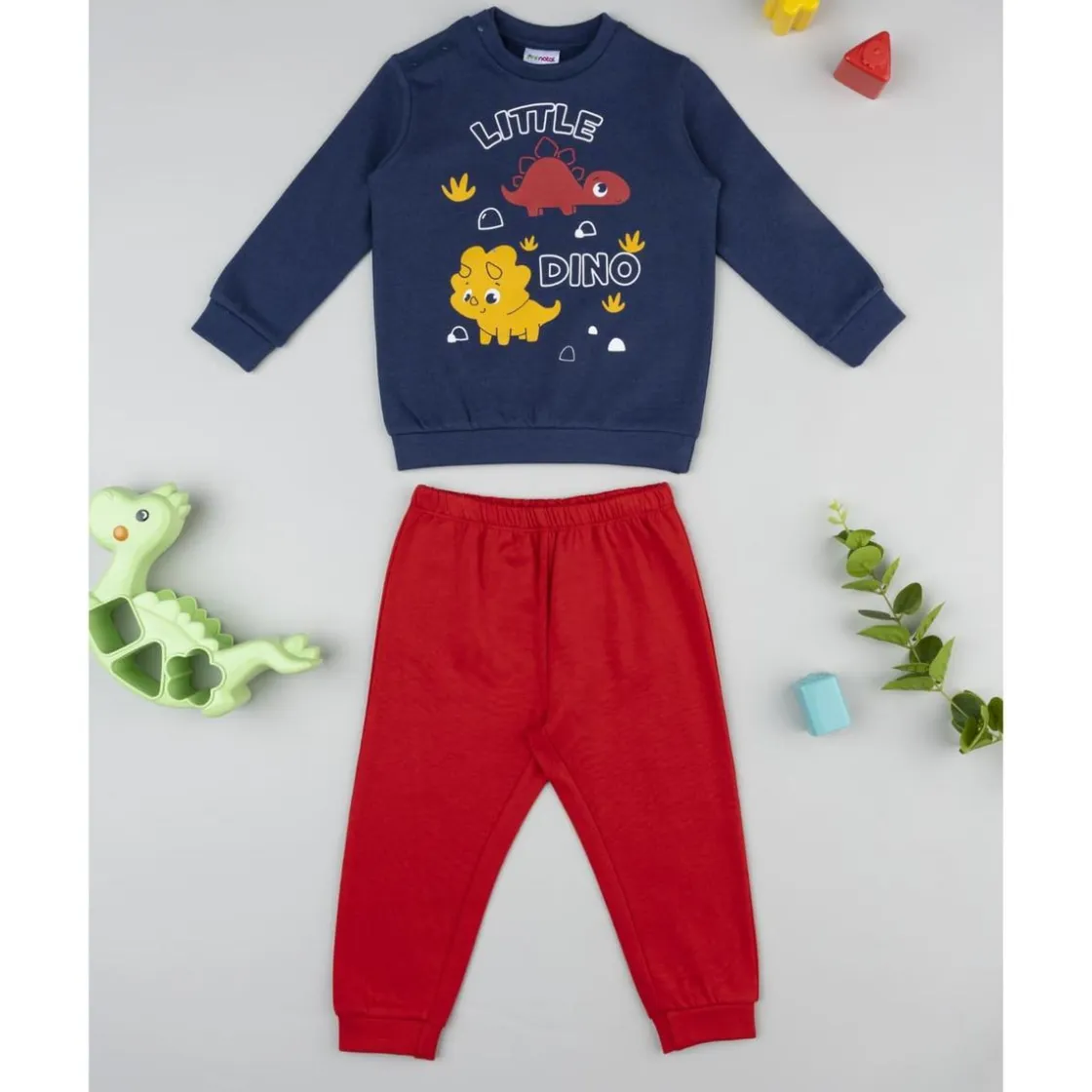 El pijama de dos piezas para niño combina estilo y comodidad. La camiseta en azul marino presenta un divertido estampado de dinosaurio en el frontal y prácticos botones automáticos en el hombro. El pantalón, en rojo intenso, incorpora cordón ajustable en la cintura para adaptarse fácilmente al cuerpo.