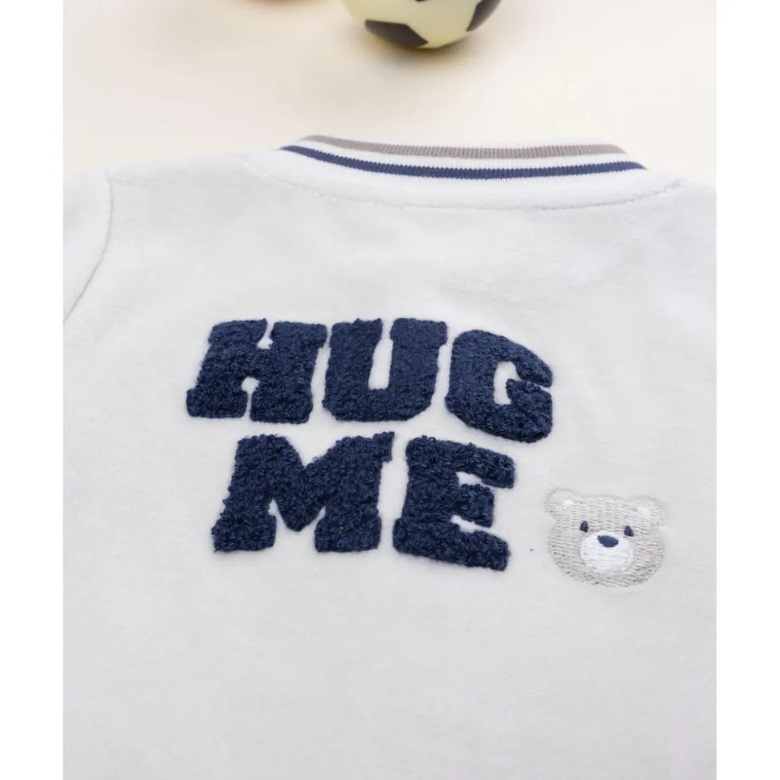 El pijama entero en suave terciopelo beige luce un parche frontal “Adorable” en azul, a juego con puños y cuello. Con apertura delantera y automáticos en la entrepierna, permite cambios rápidos sin enfriar al bebé. Tejido certificado que ofrece seguridad y confort en contacto con la piel.