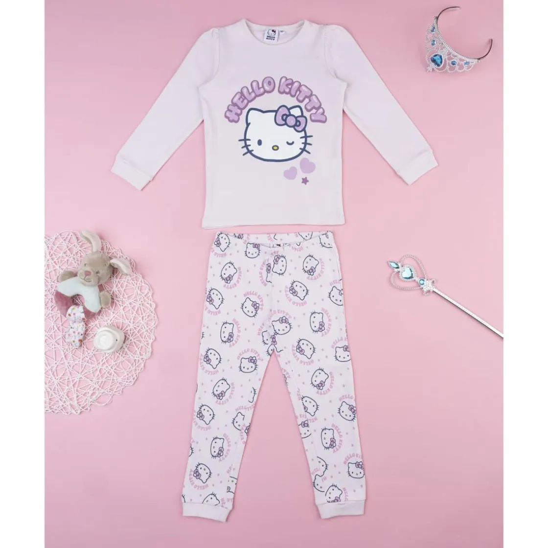 Este tierno pijama infantil de dos piezas está compuesto por camiseta de manga larga en rosa con estampado de Hello Kitty y pantalón a juego con estampado integral. Su tejido en algodón suave asegura comodidad y transpirabilidad durante la noche.