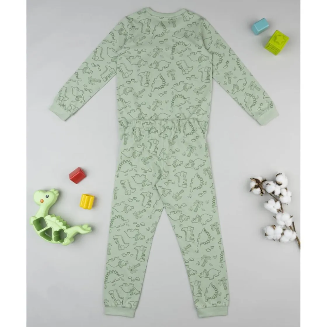 Este pijama de dos piezas para niño tiene un diseño divertido y cómodo. La camiseta de manga larga es de color verde y presenta un estampado de dinosaurios en todo su cuerpo. Los pantalones, a juego con la camiseta, tienen una cintura elástica para un ajuste perfecto y cómodo. Ideal para los días de descanso o para dormir, es una prenda versátil y cómoda para el día a día.