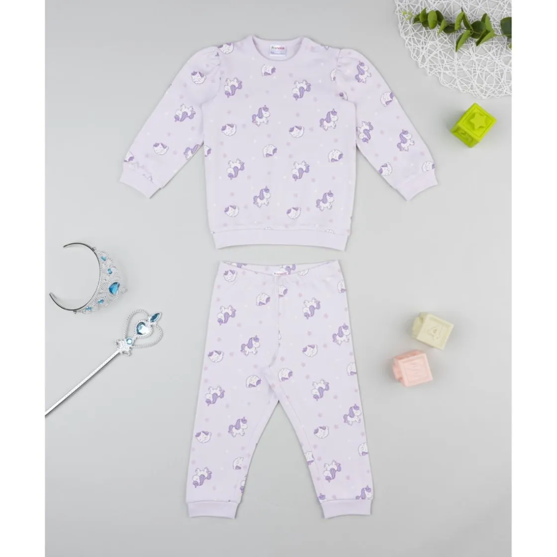 Este pijama de niña de dos piezas combina ternura y comodidad. La camiseta de manga larga en tono lila luce un estampado allover de unicornios con botones automáticos en el hombro, facilitando la puesta. El pantalón, también en base lila, incluye cintura elástica para un ajuste perfecto.