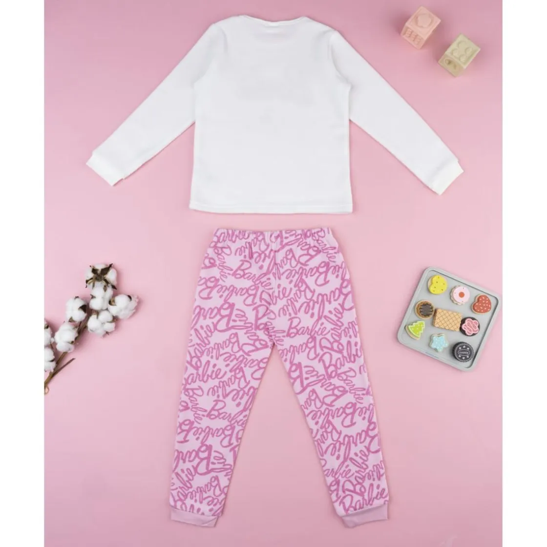 Pijama de dos piezas en tejido polar para niña, con sudadera de manga larga y cuello redondo que luce la mítica palabra “Barbie” en rosa, y pantalón con cintura elástica y estampado integral en blanco y rosa. Suave, ligero y muy cálido, está pensado para noches de invierno y ratitos de relax en casa.