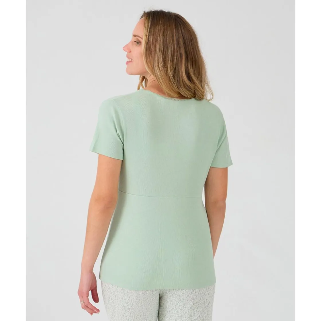 Pijama premamá lactancia. Camiseta de manga corta verde con tejido de canalé y bordado de encaje a juego. El suave escote en V cruzado puede facilitar la lactancia. Pantalón con estampado de flores por todas partes. El ajuste es suave y relajado. Diseñado para ser usado también durante el embarazo.