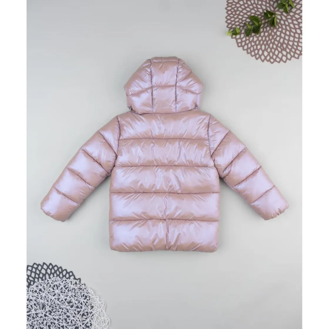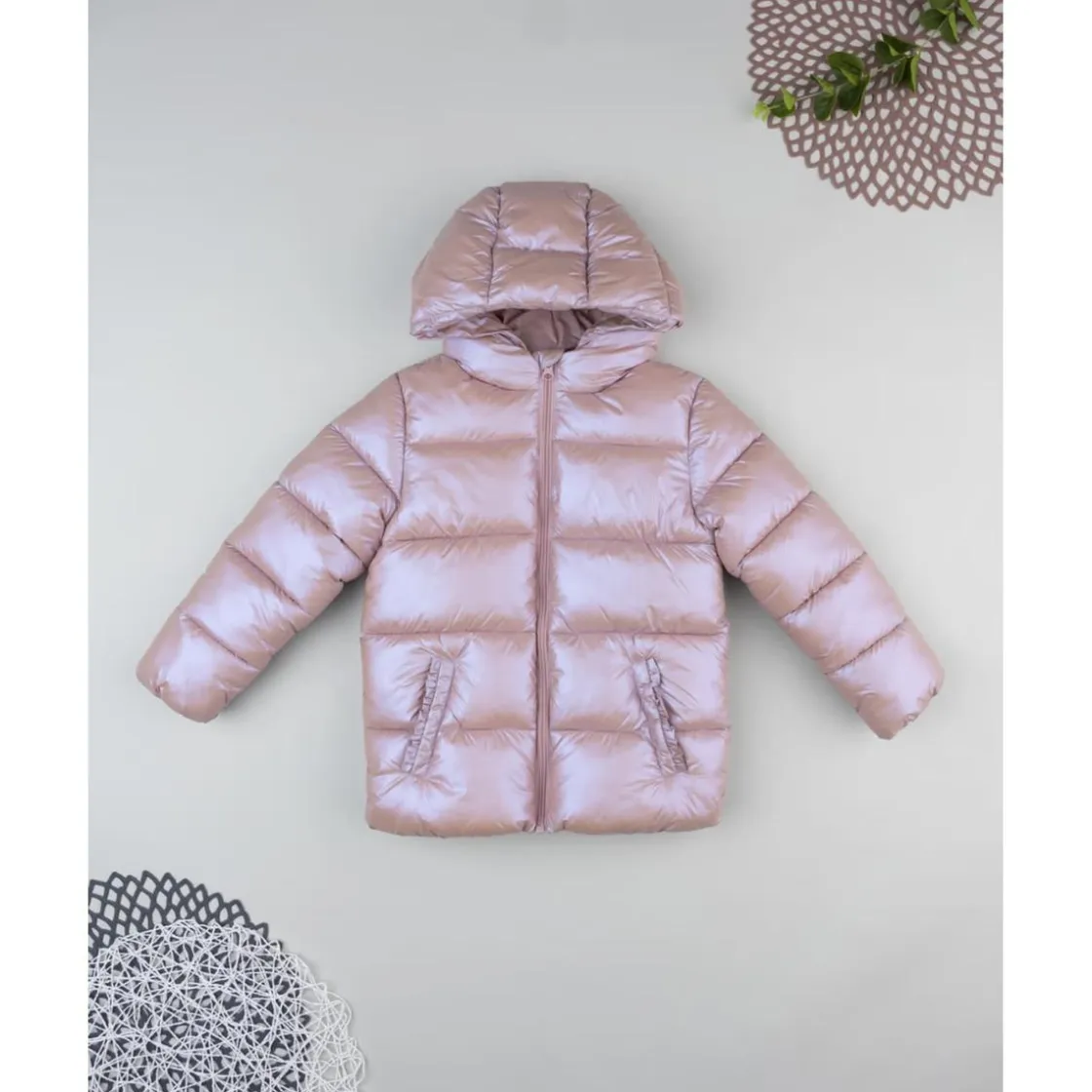 El plumífero con capucha en acabado rosa metalizado es una prenda moderna y funcional para los días fríos. Con bolsillos laterales en diagonal y un interior suave, ofrece abrigo y estilo en una sola pieza.