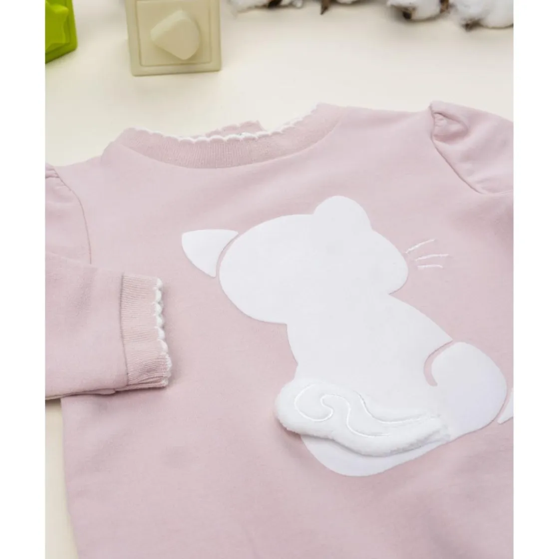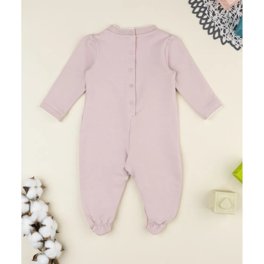 Encantadora ranita para recién nacida en color rosa claro, con aplique central de gatito y cola en relieve. Cierre con botones a presión en la espalda y entrepierna para facilitar el cambio. Ideal para los primeros meses del bebé.