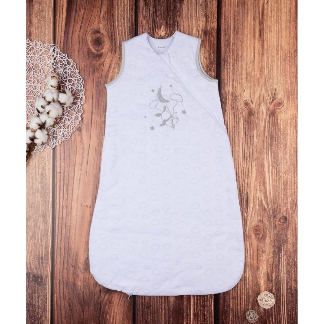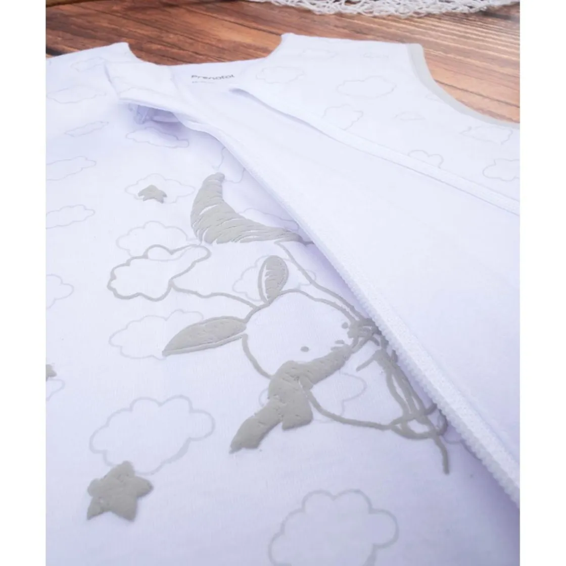 Tierno saco de dormir en jersey blanco con estampado de conejitos grises. Cierre con cremallera frontal, suave y cómodo. Ideal para mantener al bebé calentito con estilo.