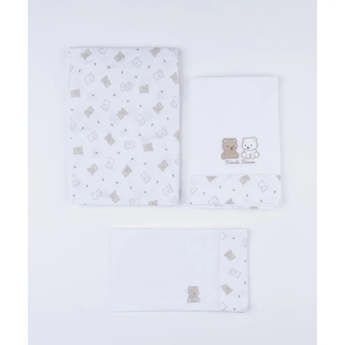Un set de sábanas para bebé con estampado de ositos que aporta ternura al dormitorio. Incluye sábana bajera blanca con dibujo all over de ositos, sábana encimera que repite el motivo en la bordura y se completa con un patch a juego, y funda de almohada coordinada. Su tejido suave y transpirable crea un entorno cómodo para el descanso.