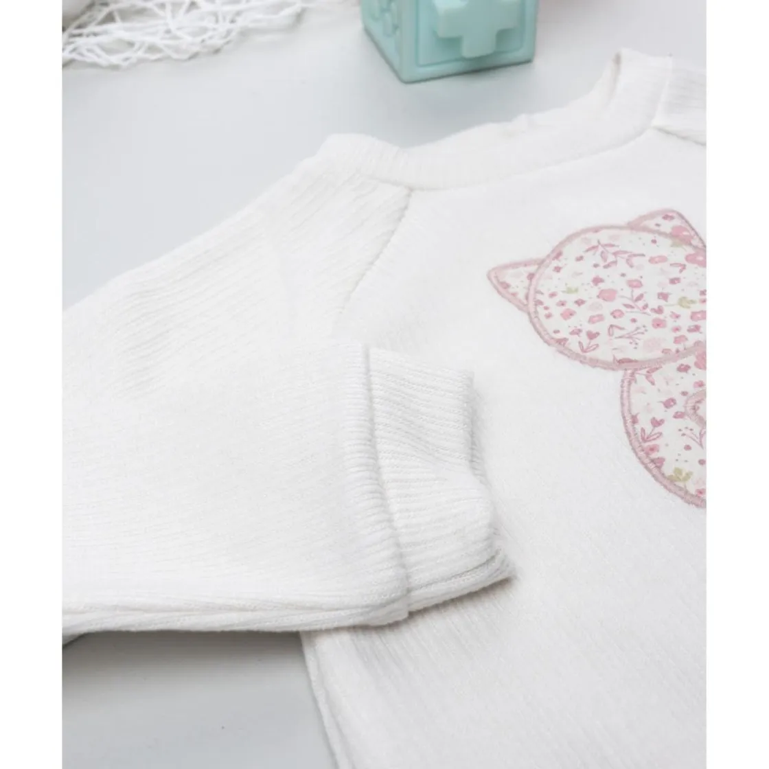 Esta sudadera infantil de manga larga se presenta en blanco con ilustración de gato en la parte frontal. El modelo incluye mangas raglán y cierre trasero con botones automáticos para facilitar la puesta. Confeccionada en mezcla de fibras, ofrece suavidad y ajuste práctico.