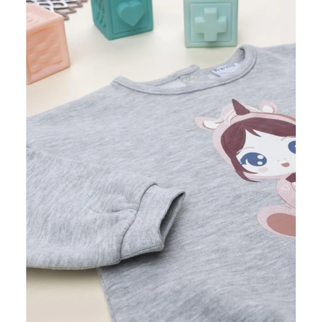 La felpa gris para niña es una prenda básica y acogedora, ideal para los días más frescos. De color gris claro y estampado coordinado, ofrece un estilo casual y actual. Su interior aafelpado proporciona calidez y confort, mientras que los botones automáticos en la espalda facilitan el vestir.
