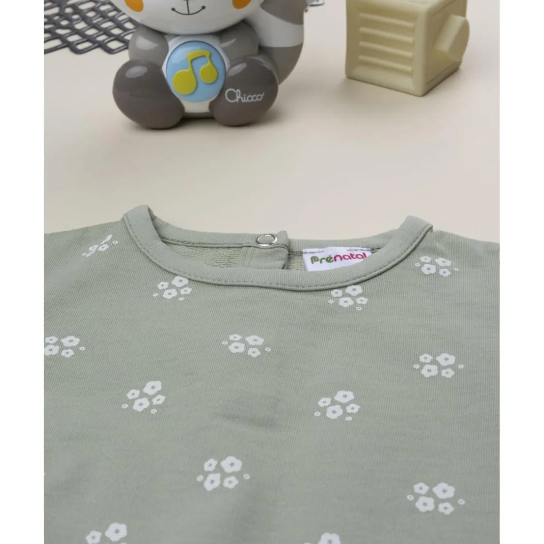 Sudadera casual afelpada para niña, en verde claro con delicado estampado floral blanco. Suave, cómoda y con botones automáticos en la espalda. Perfecta para climas frescos y looks informales.