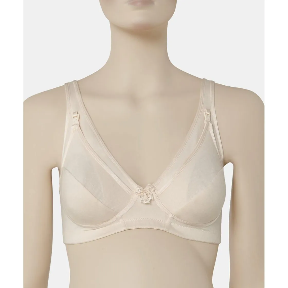 Sujetador de lactancia en ligera y resistente lycra de algodón en color piel con copa D y un pequeño lazo de encaje ton sur ton aplicado en el centro. Forma y materiales están diseñados para sostener el busto sin apretarlo, las copas son desmontables y los tirantes están acolchados y son ajustables. Cierre práctico con ganchos ajustables.