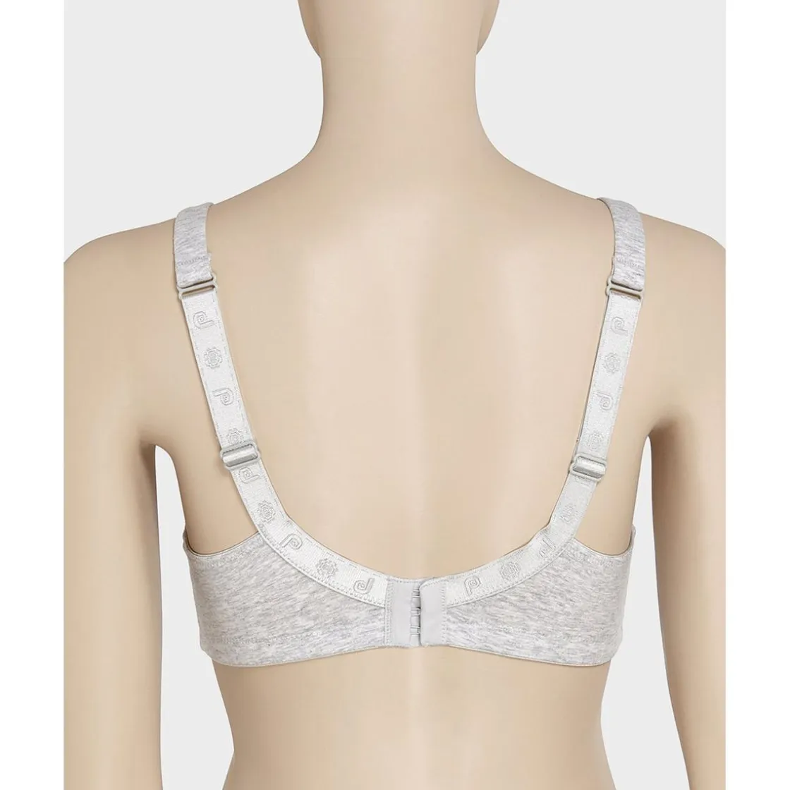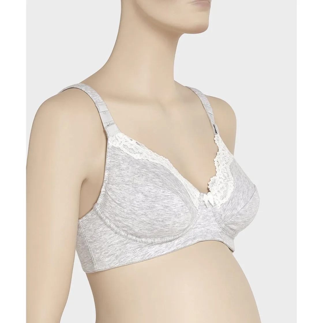 Sujetador de lactancia gris claro jaspeado sin aros copa C con inserciones de encaje blanco y un lindo lazo de satén blanco aplicado en el centro. Los tirantes son acolchados y ajustables para apoyar mejor el peso del pecho.