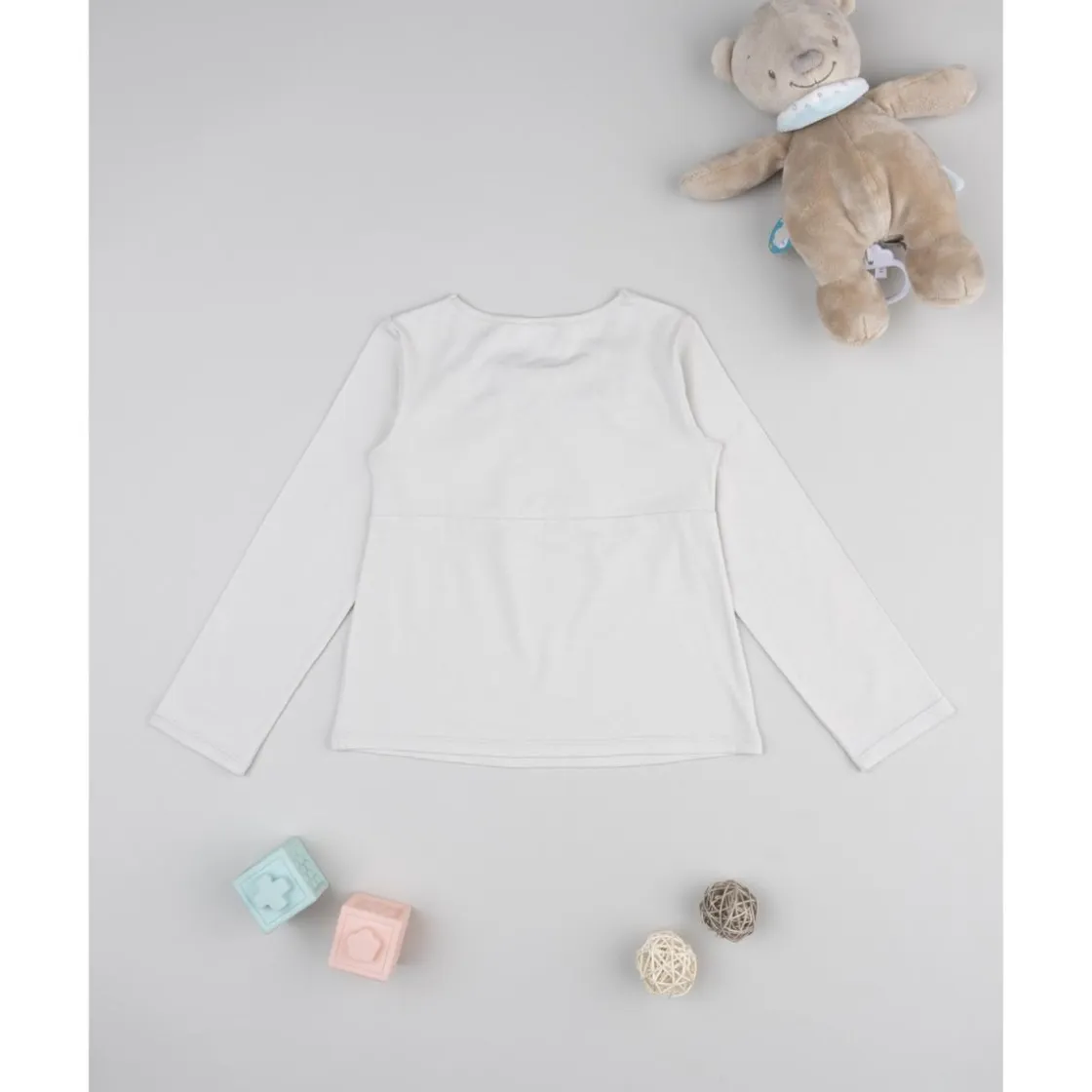 Esta romántica t-shirt de manga larga para niña combina estilo delicado y comodidad. Su color beige claro se realza con flores bordadas alrededor del escote redondo, creando un detalle femenino y elegante. Los lazos y la ligera arrugadura en el cuello aportan un toque encantador, mientras que la prenda mantiene una vestibilidad práctica y cómoda para el día a día. Fabricada en 58% algodón, 37% modal y 5% elastano, ofrece suavidad, elasticidad y confort. Ideal para combinar con pantalones, faldas o leggings, esta t-shirt es un básico versátil para cualquier armario infantil.